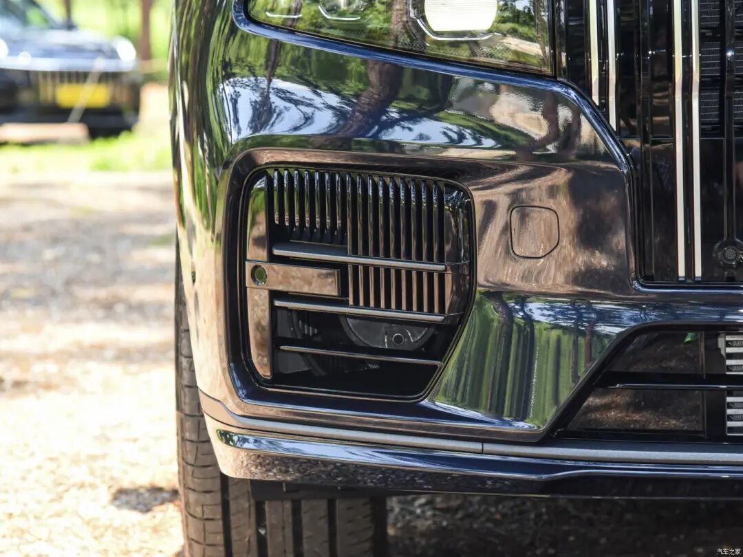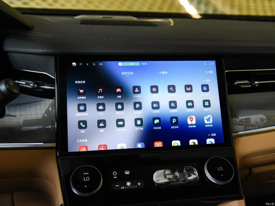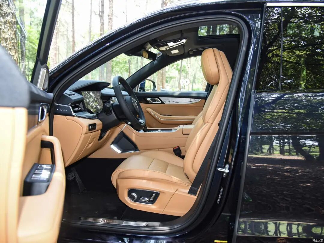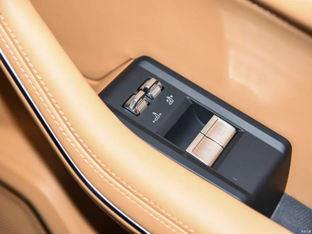 车内设计部分,该车采用了黑棕双色搭配,营造出豪华感。它拥有全彩HUD、12.3英寸全液晶仪表、12+6英寸中控屏以及2个1.4英寸液晶旋钮屏。车载智能座舱拥有高通骁龙8155芯片,支持AI语音等功能。