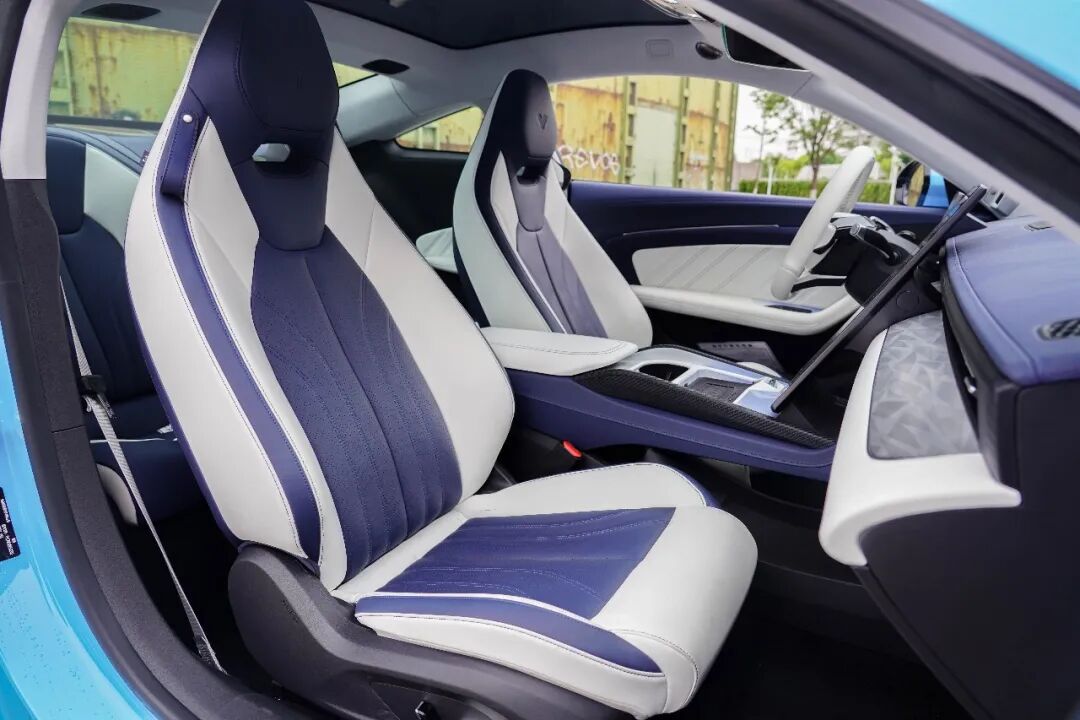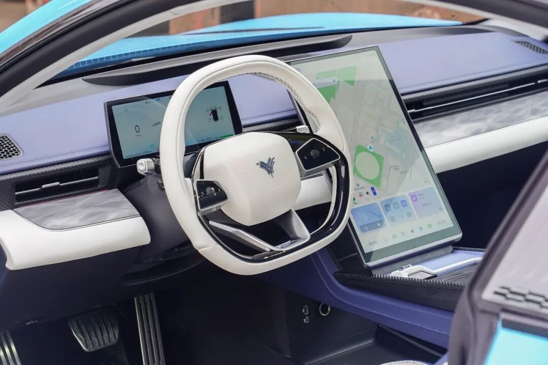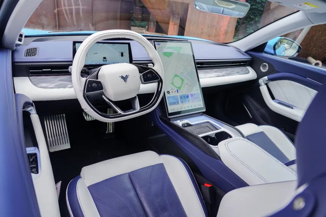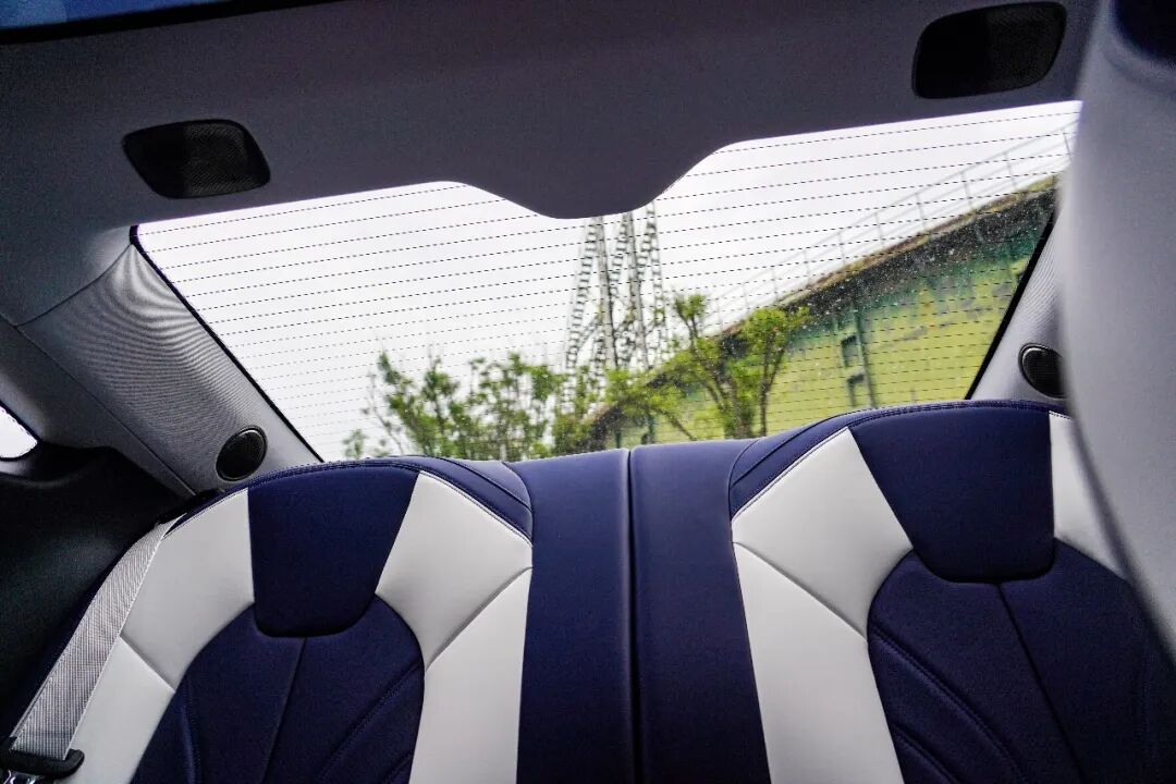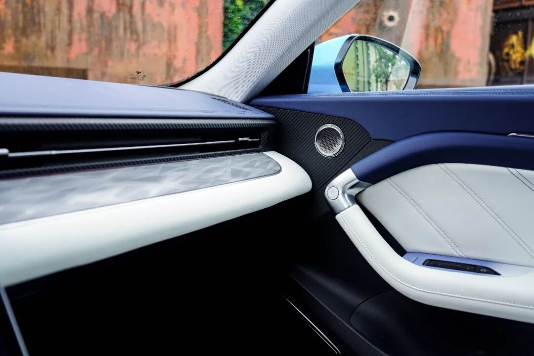 大量的横向线条使得这套设计看上去尤为简约,而整个车内的视觉中心无疑是这块17.6英寸的大屏。蓝白配色则将豪华感得以拉升,同时用料上也值得称赞,大量碳纤维纹理饰板的使用,则让运动氛围暴增。
