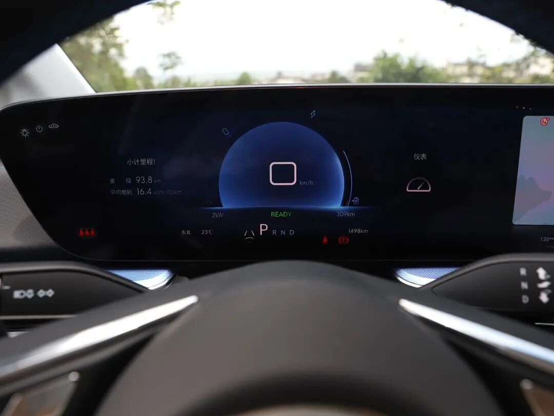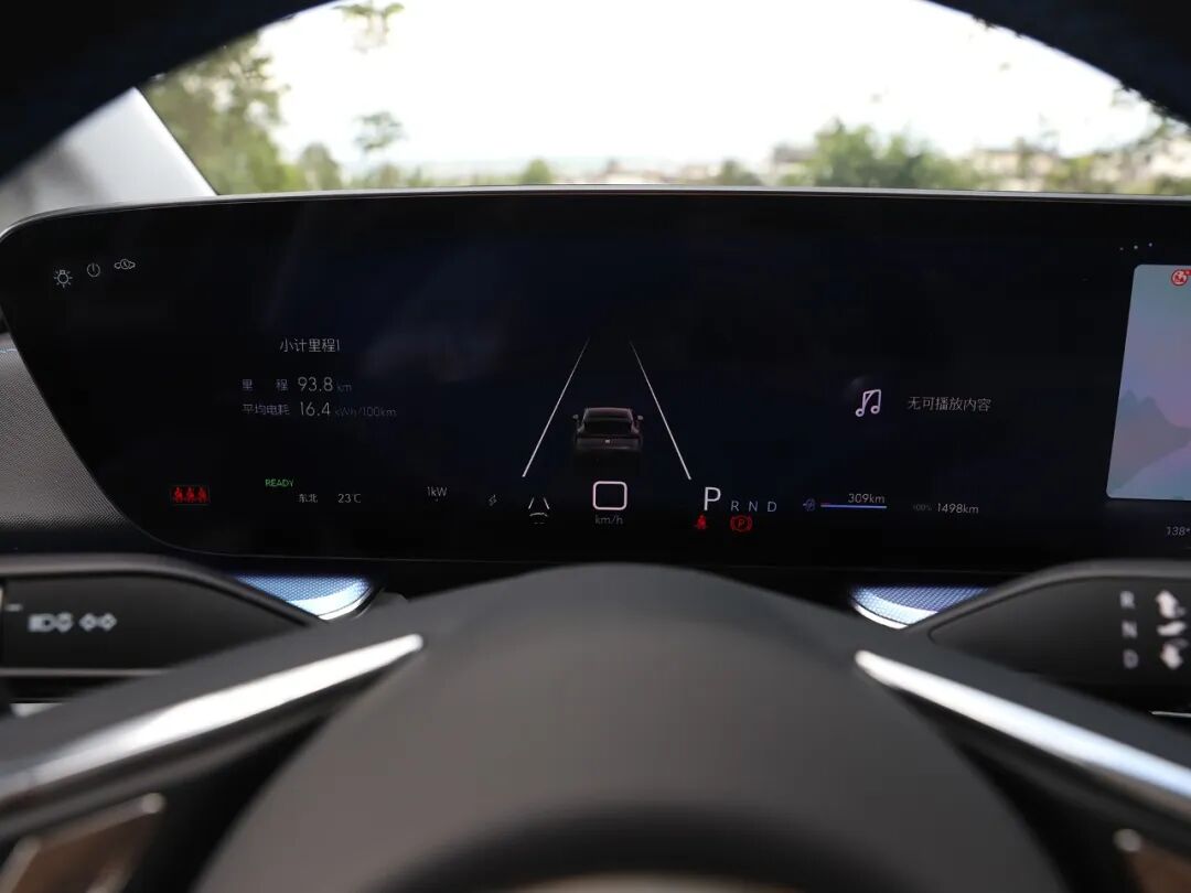 仪表盘UI设计出色,提供电量、地图导航、驾驶辅助以及仪表等不同显示模式,显示信息也足够丰富,此外左侧还设置有灯光触控按键。