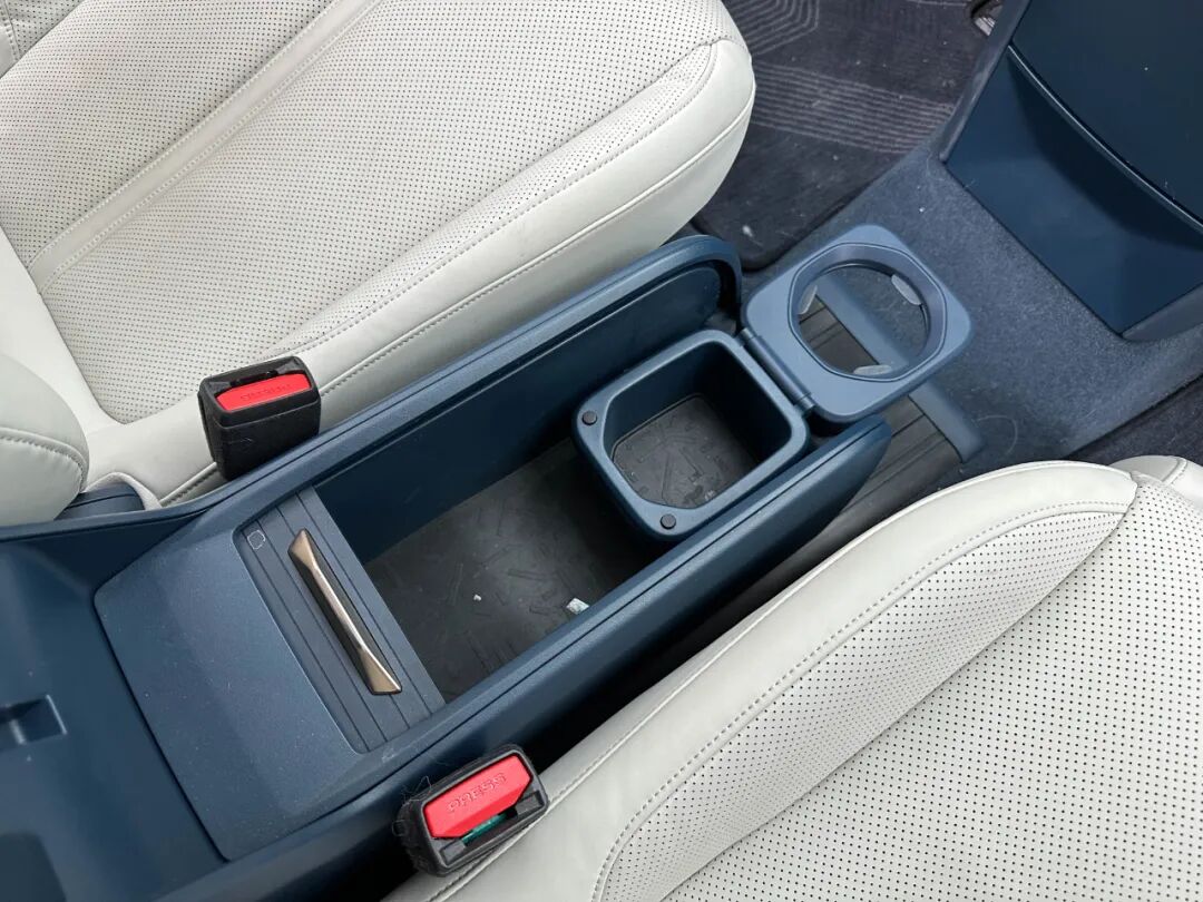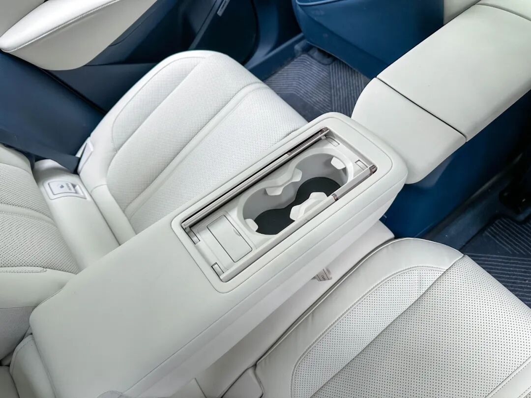 四座版车型第二排座椅中间位置为储物盒,同时座垫具备电动向上翻折功能,无论是放置大件行李又或是带宠物出行都会更加便利。在后排座椅翻折后,副驾驶座椅可以大幅度向后移动,形成躺平的状态。