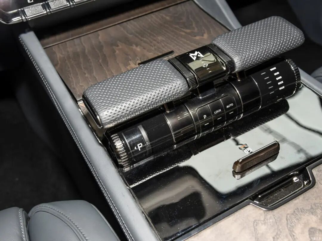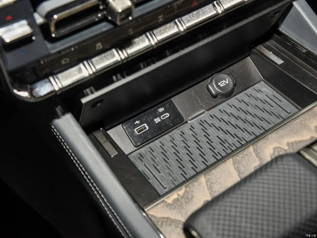 可以看到,新车中控屏内部的UI设计比较现代化,预计将会拥有比较流畅的操作体验。此外,新车前排集成了各种样式的充电接口,同时,挡杆区域的设计比较独特——采用了类似双挡杆的设计,左侧为挡位选择,右侧则为驾驶模式选择,拥有雪地、沙地、岩石等模式。