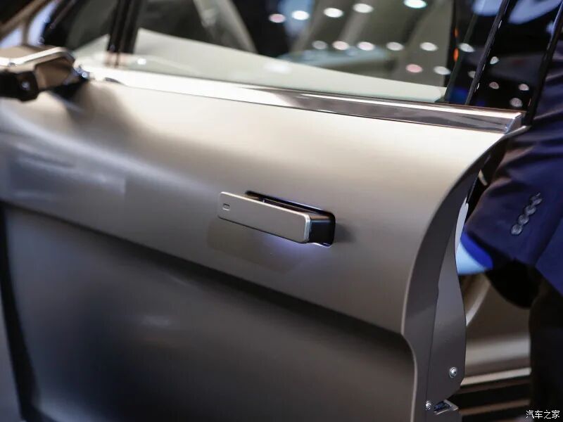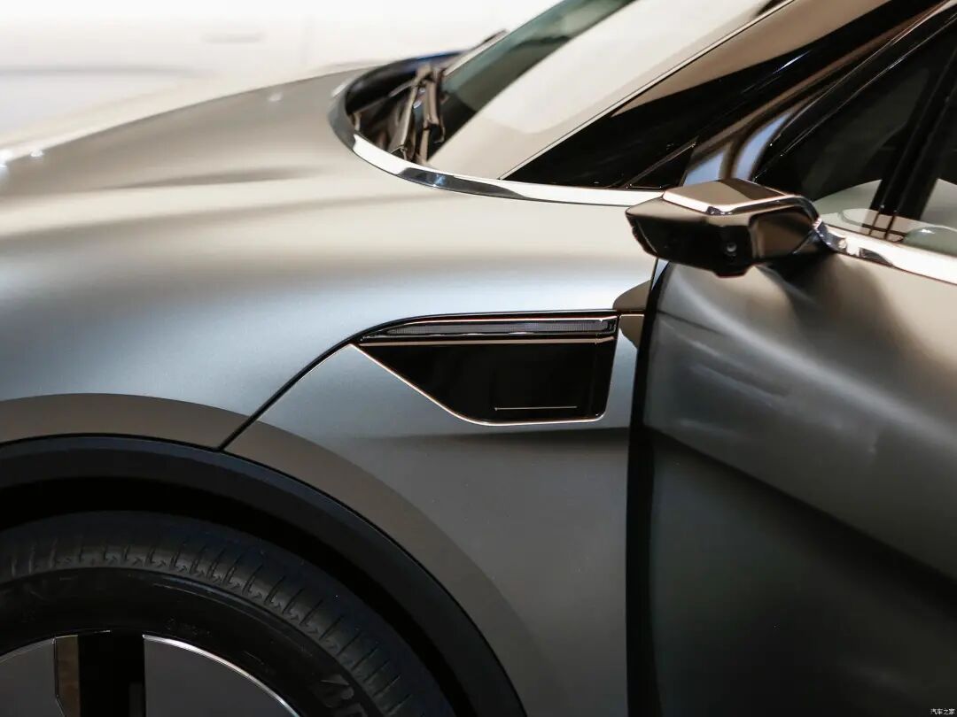 目测概念车为中型SUV,实拍车型采用磨砂材质车漆,并在车顶和 A/B/C/D柱采用亮黑色设计,构成双色车身。细节处,可以看到隐藏式门把手、流媒体后视镜和低风阻轮圈等配置。
