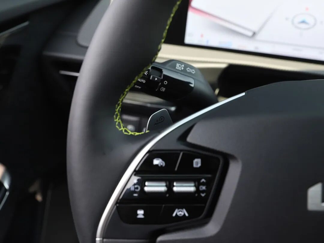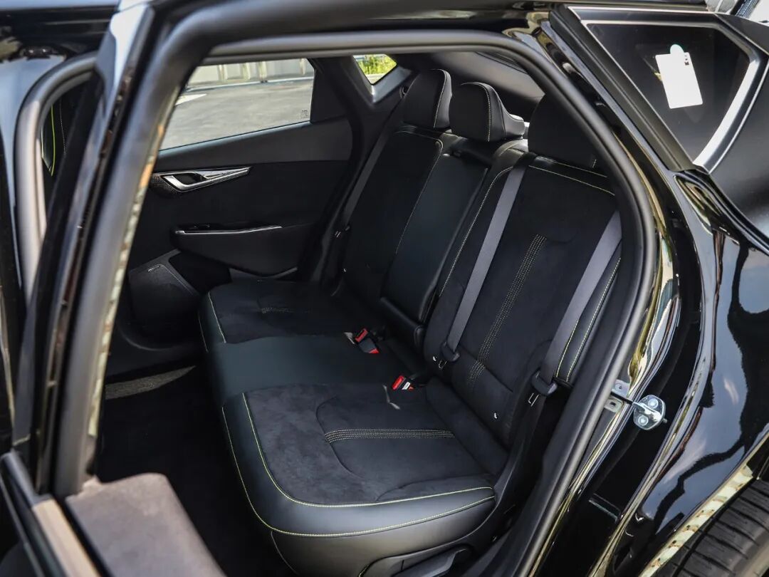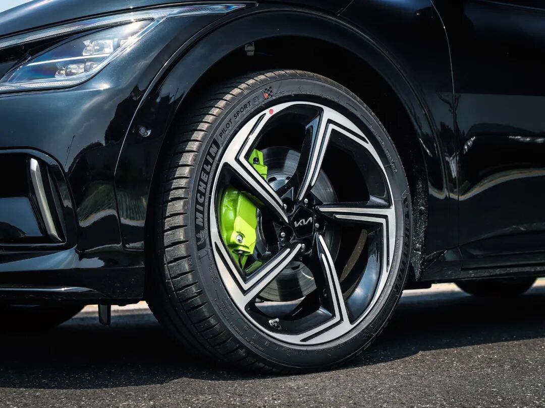 GT车型采用专属的21英寸五辐回旋镖样式双色轮圈,搭配荧光绿色四活塞刹车卡钳,视觉感受非常张扬激进,性能感非常直给。轮胎采用米其林PILOT SPORT EV(竞驰EV)系列,专为电动车打造的运动操控型轮胎,规格为255/40 R21。