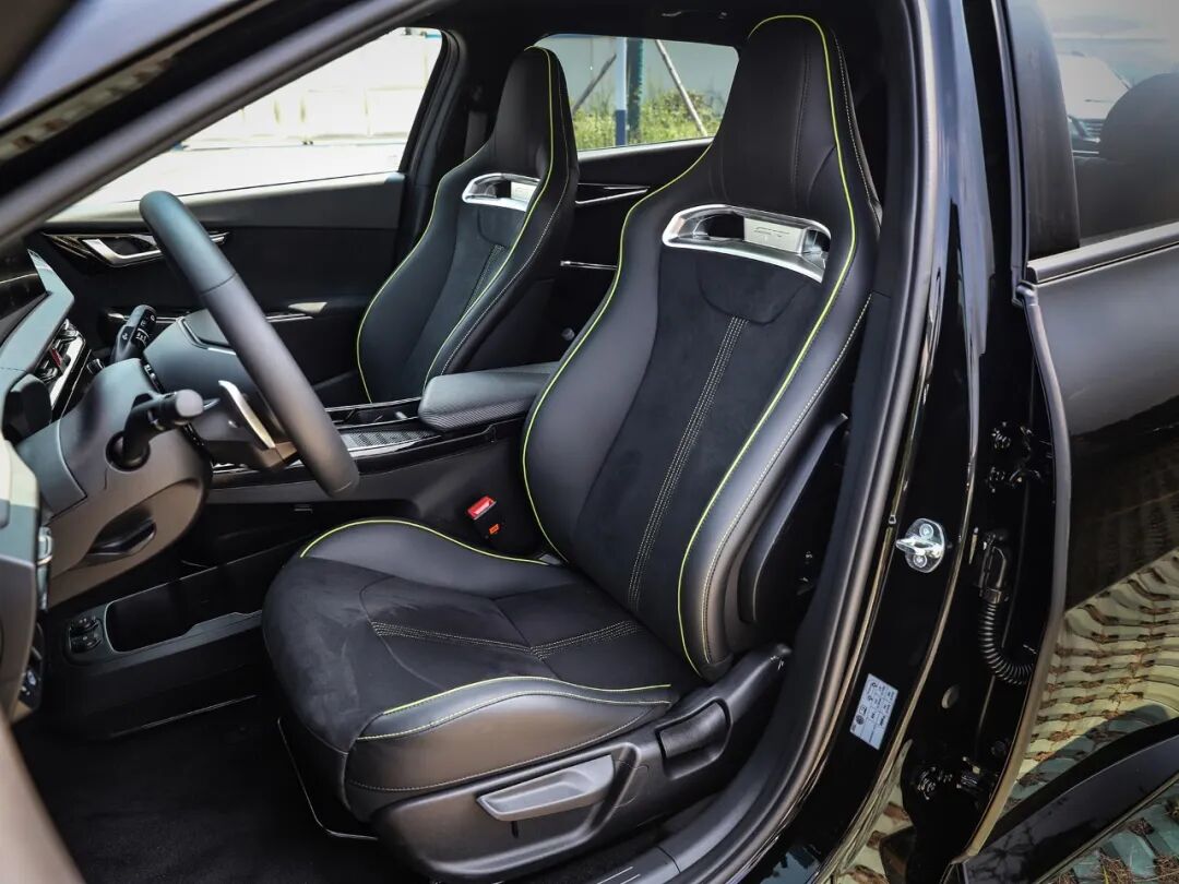 包裹性出色的麂皮一体式运动座椅是GT车型专属,靠背镂空位置采用银色元素装点并刻有GT标识,点缀的荧光绿色元素与刹车卡钳涂装形成呼应。需要说明的是,前排座椅采用手动调节,但支持座椅加热。