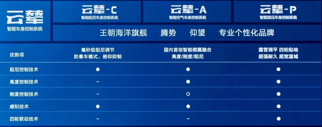 作为一套主动式车身控制系统,云辇技术包含了性能不同的多套主动式车身控制系统,分别是云辇-C、云辇-A、云辇-P以及云辇-X。目前,比亚迪汉部分车型已经预埋了云辇-C的硬件,软件则将通过OTA进行升级。