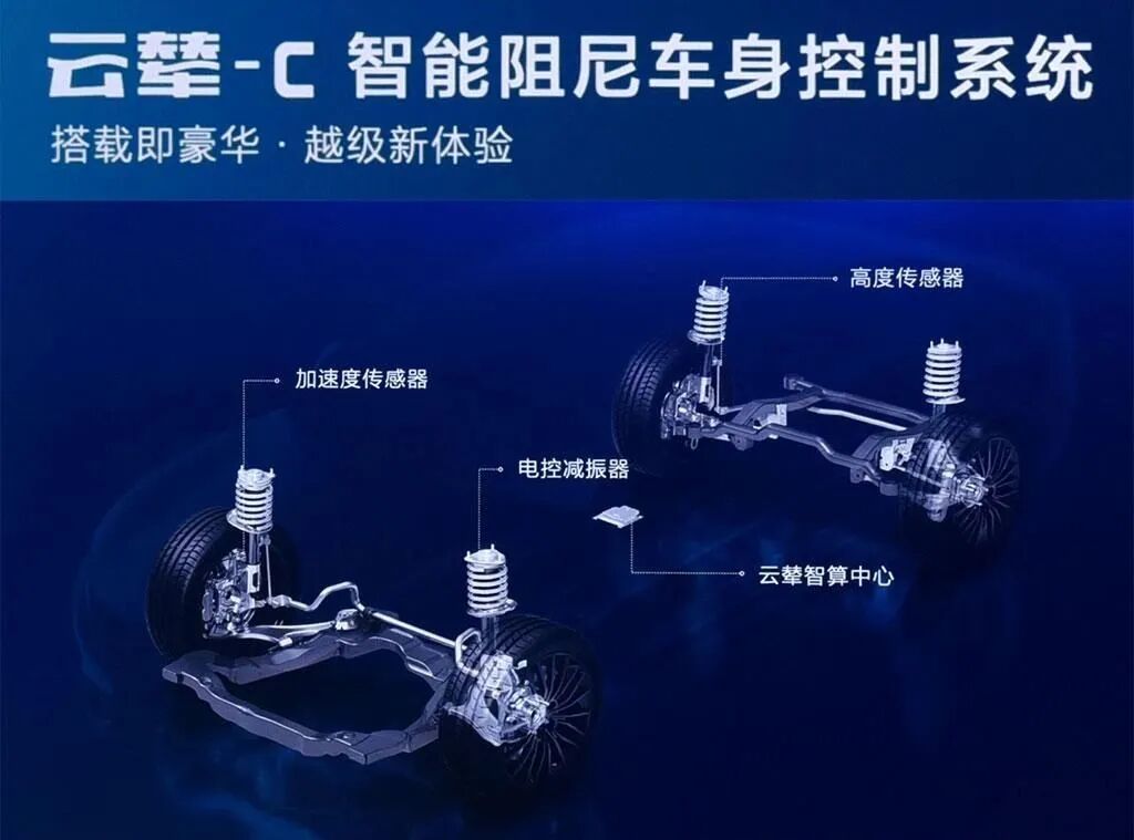 官方称,在60km/h通过连续振动路面工况下,云辇-C可助益整车达成96%的隔振率;在时速100km/h的双移线工况下,云辇-C助益整车侧倾角速度降低39.7%,操控性大幅提升。