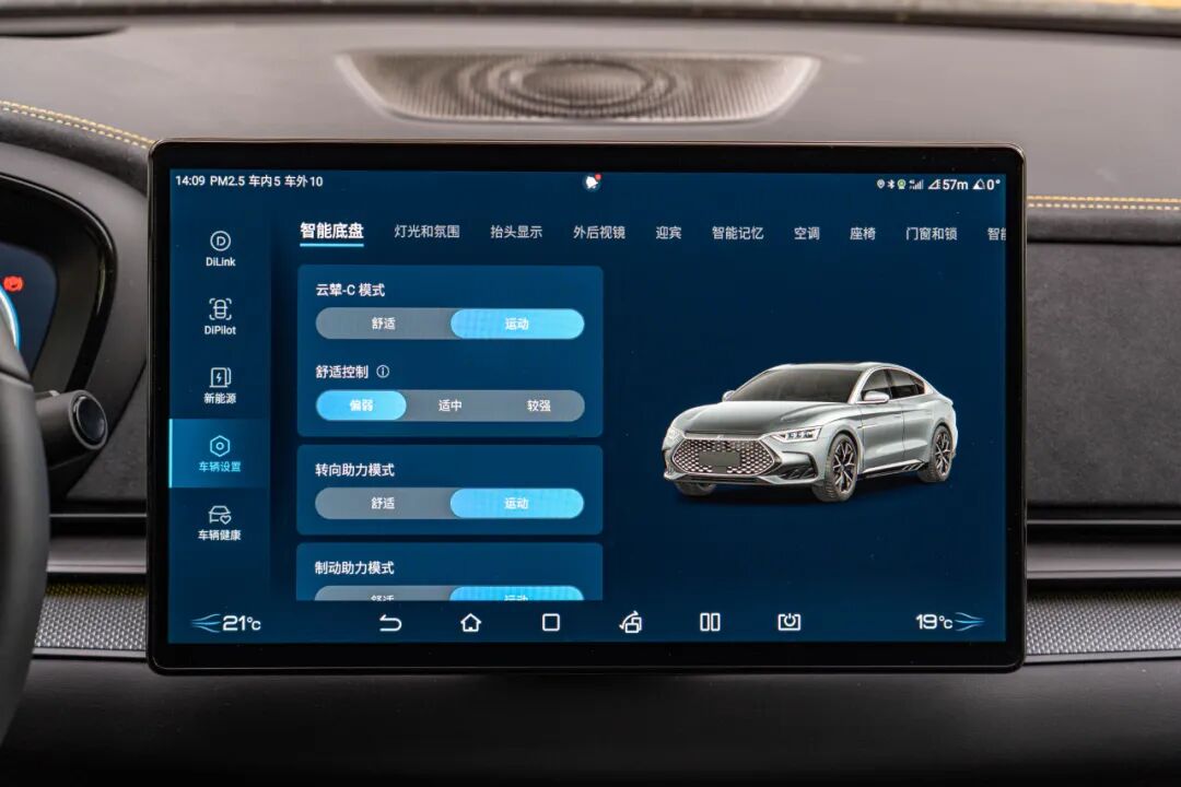 通过15.6英寸自适应旋转悬浮Pad进入车辆设置,就可以看到云辇-C智能阻尼车身控制系统的设置界面了,其中云辇-C模式提供了舒适与运动两挡,舒适控制提供三挡可调,此外则为转向助力、制动助力的模式调整。