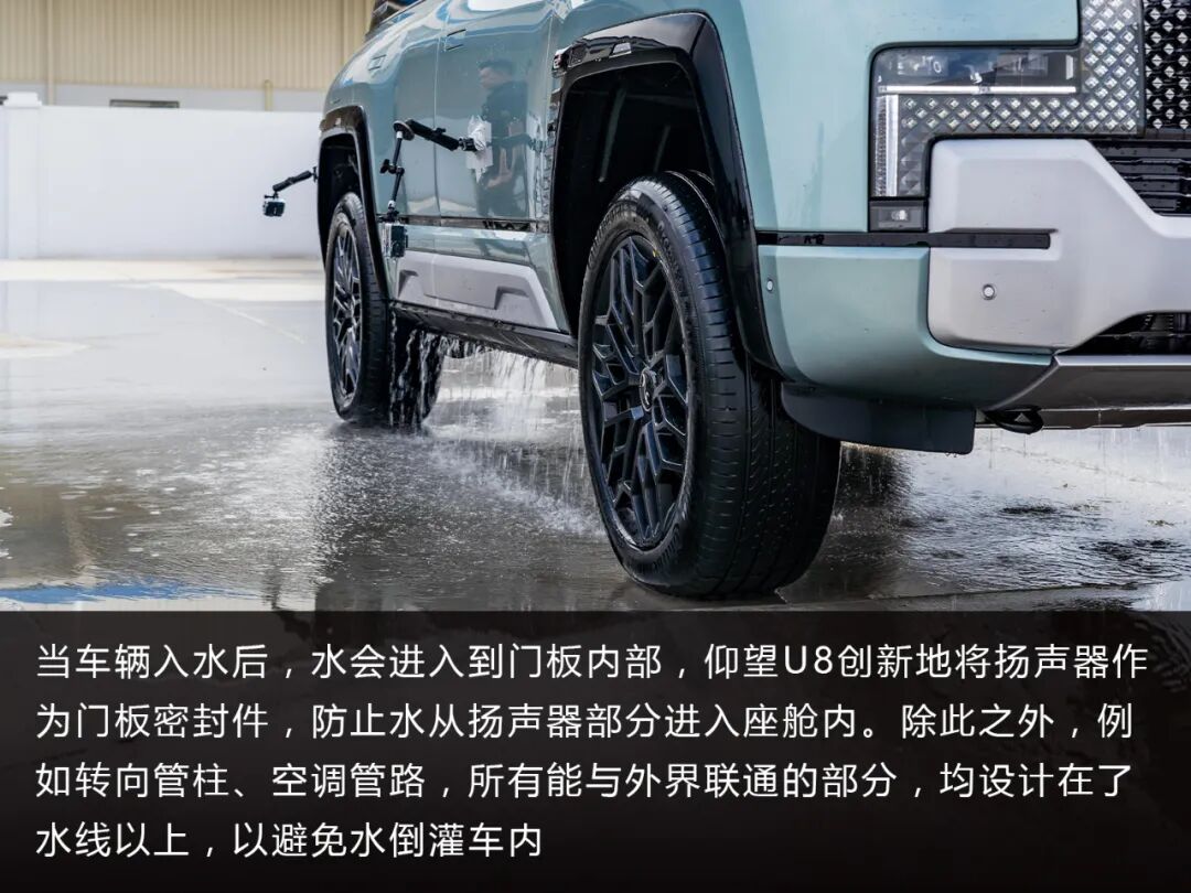 为了实现浮水,在彩车身制造过程中就需要下足功夫。焊接阶段,U8车身涉及3000多个焊点和螺柱,突破了焊接击穿的难题,实现99.97%的合格率;涂胶阶段,增加白车身和彩车身涂胶部位,严格要求涂胶精度、厚度与溢胶量;装配阶段,装配工艺采用全新密封设计,严格要求密封装置与车身连接处所有螺母的紧固力矩,使密封圈等装置与车身紧密贴合。