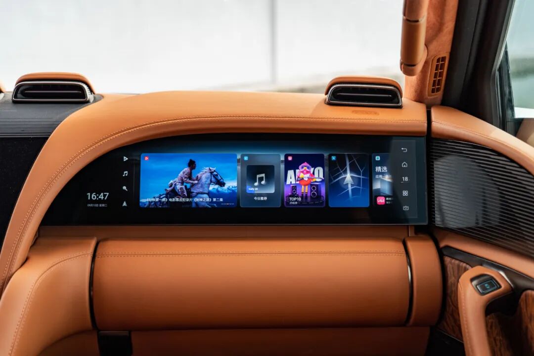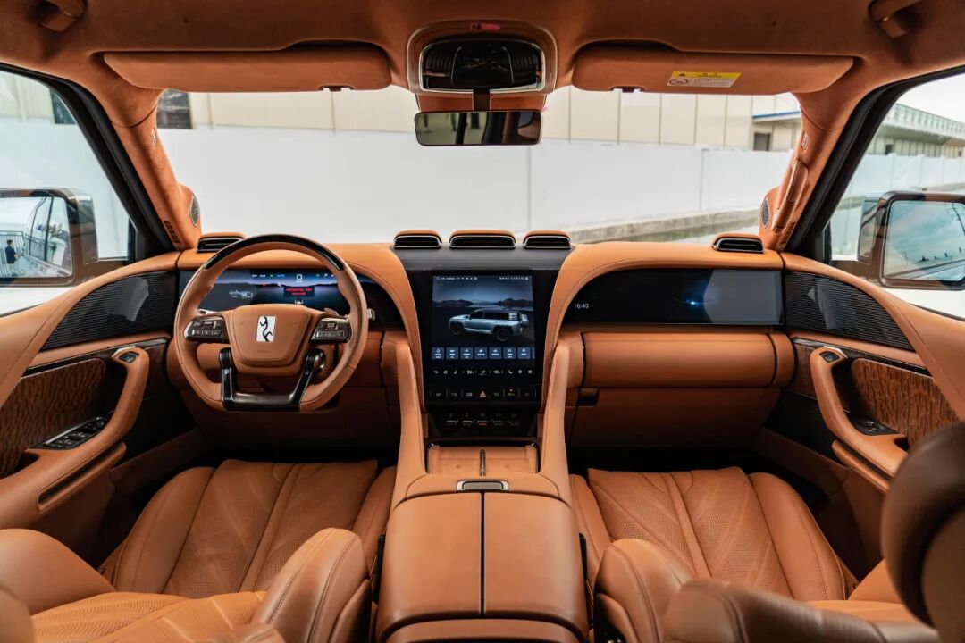 进入车内,仰望U8采用星环座舱设计,运用大面积皮质包裹。全液晶仪表盘与副驾驶娱乐屏尺寸均为23.6英寸,曲面中控屏尺寸为12.8英寸,后排还有两块12.8英寸娱乐屏,支持5屏联动。