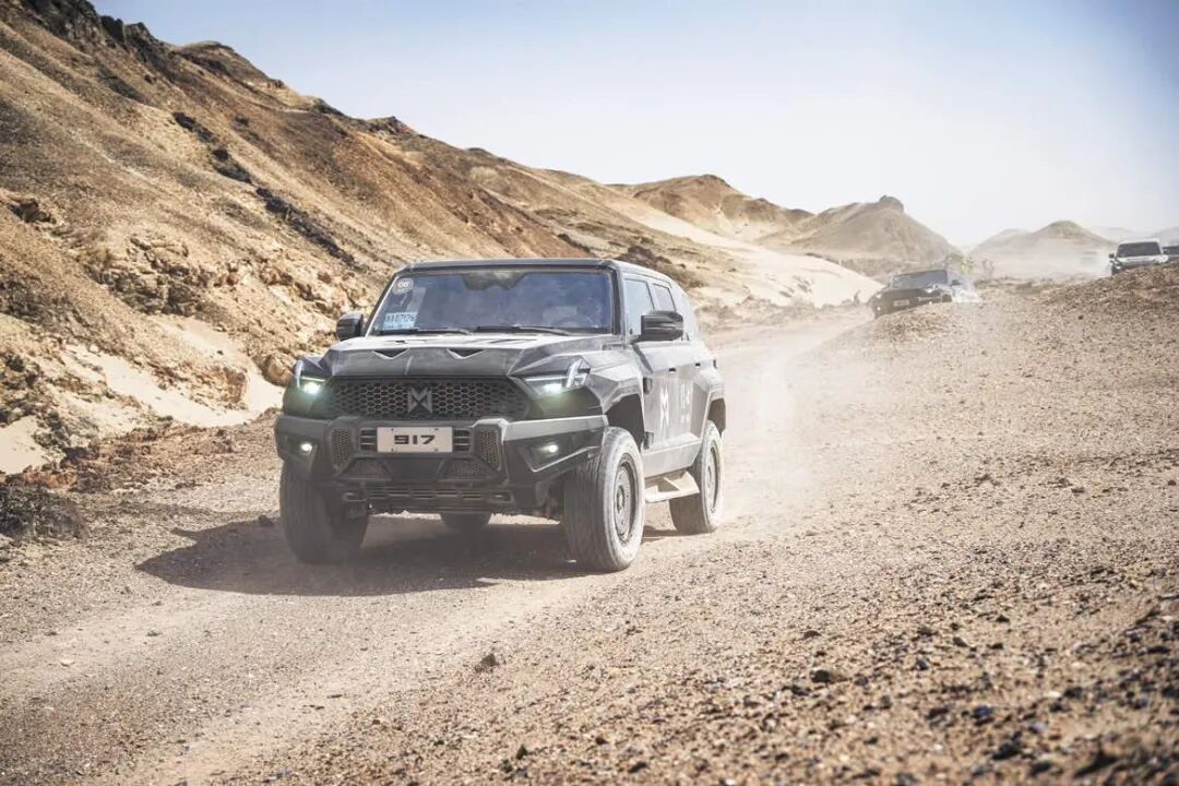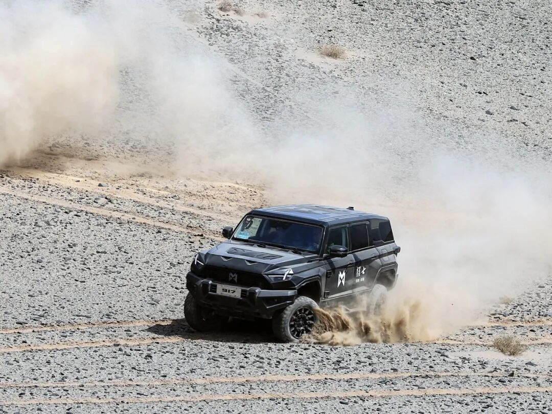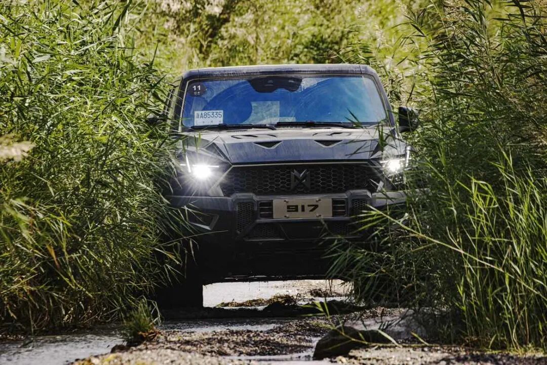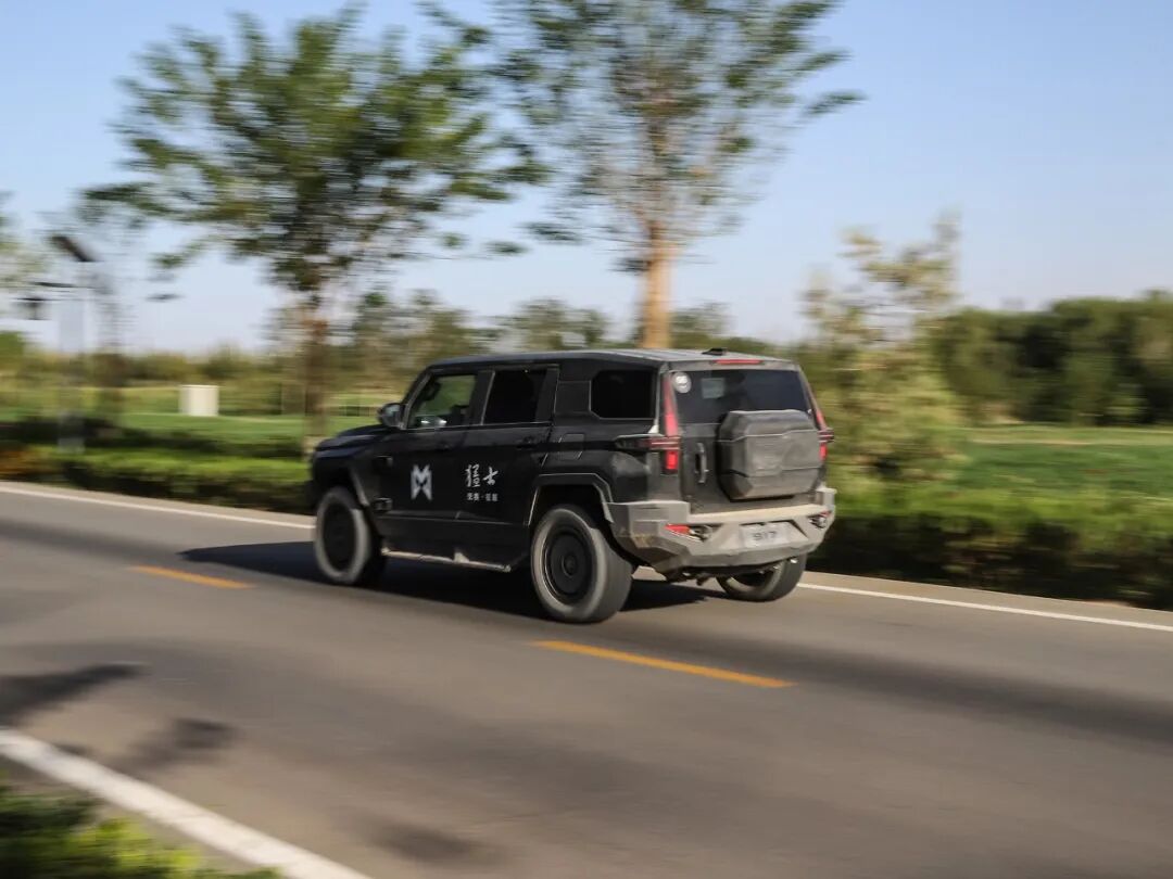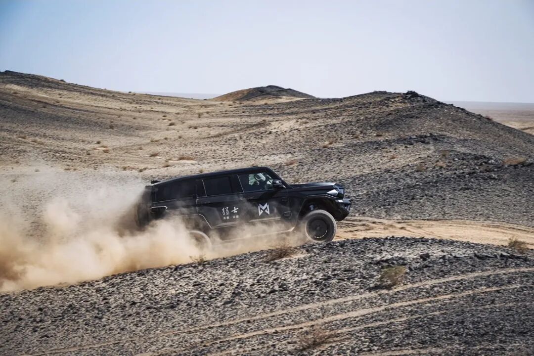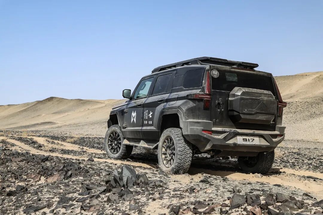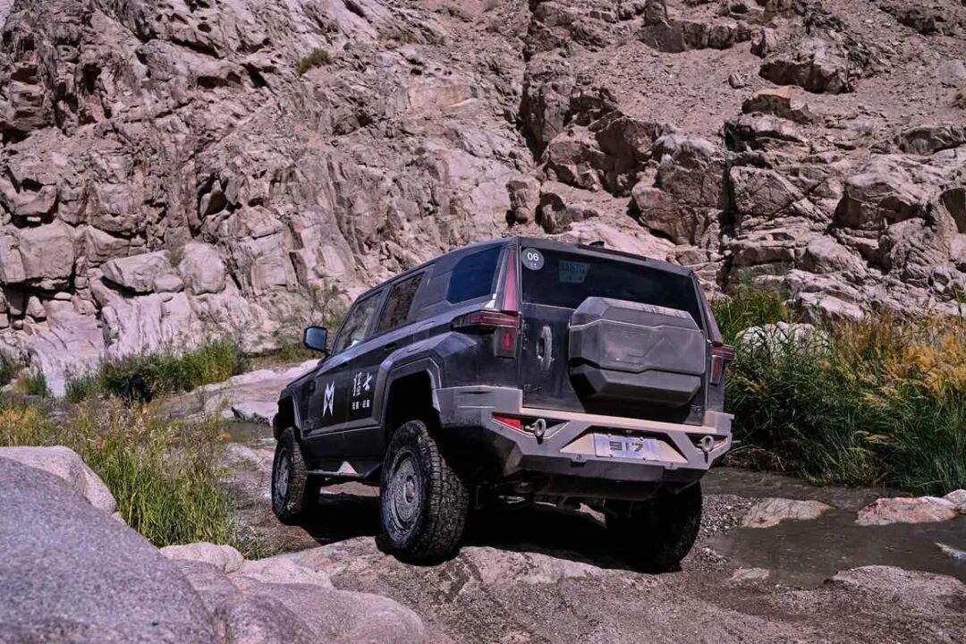 新车标配空气悬架,支持悬架高低(150mm调节行程)和软硬调节。标准状态下,猛士917接近角和离去角均为31°,通过角为19.7°;越野脱困姿态下,接近角和离去角分别为36.8°和37.5°,通过角会提升至27.9°。此外其还拥有900mm的最大涉水深度、100%的最大爬坡度和40°侧坡的通过能力。