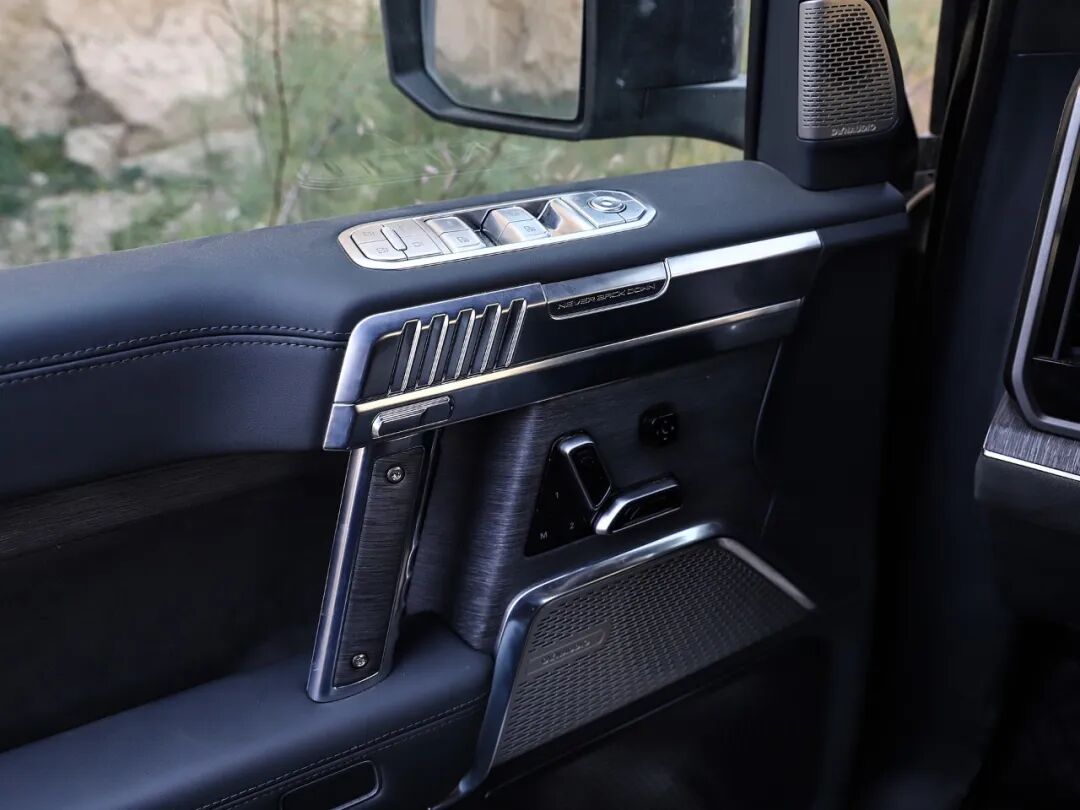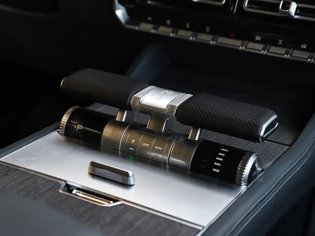 电子换挡杆造型独树一帜,类似飞机的操纵杆,从左往右依次是换挡、底盘升降、越野模式调节,真皮包裹、金属拉丝点缀展现出工业感和品质感。