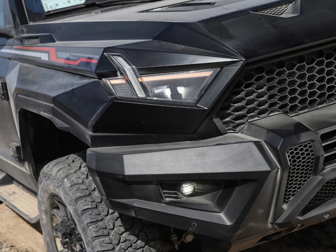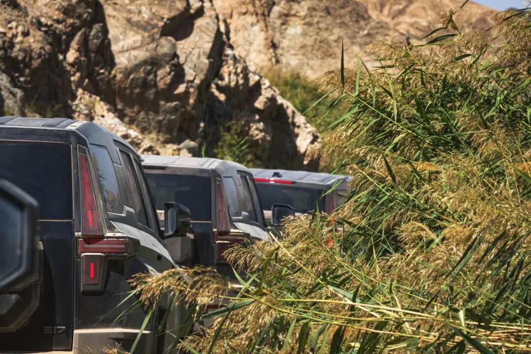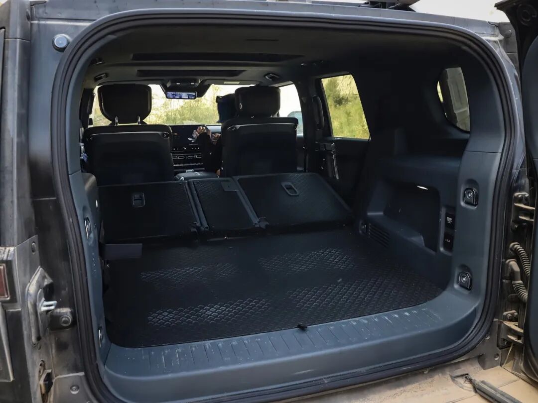 车侧同样散发出浓郁的刚硬威猛气势,上扬的腰线好似刀锋利刃穿门把手而过,外扩的轮拱营造出立体感和强大气场。实拍增程版最小离地间隙达到221mm,最大可提升至326mm,所以车侧踏板也是不可或缺的配置。