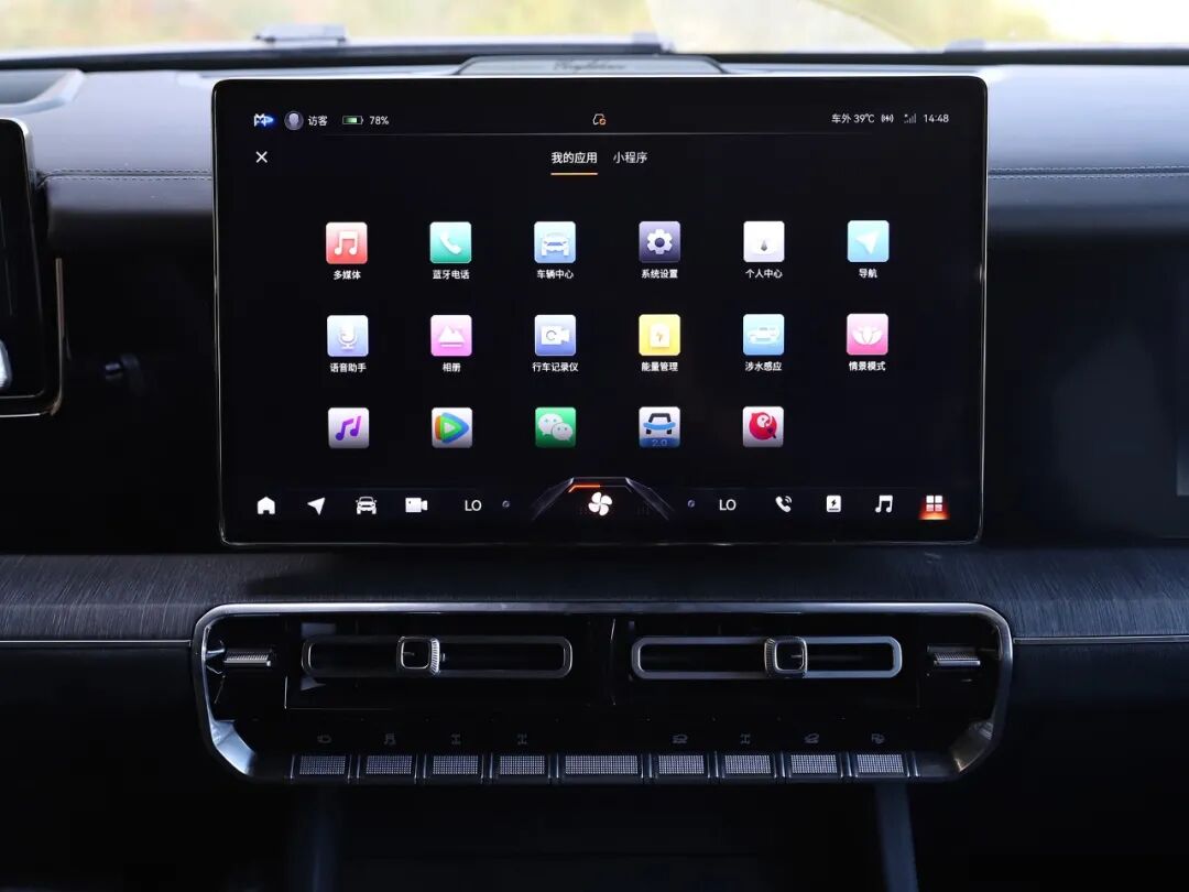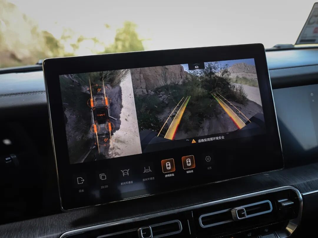 15.6英寸中控屏集成了语音助手、在线导航、影音娱乐、全景影像、车辆设置、行车记录仪、小程序等众多功能,满足日常所需丝毫没有问题。中控屏下方还有影像系统、车身稳定控制、前后差速锁、蟹行模式等的实体按键。
