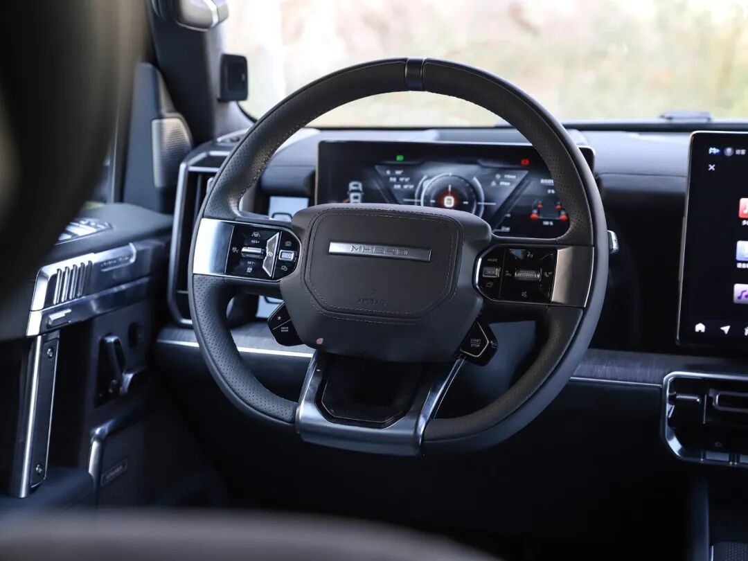 增程版由三电机驱动,电动机总功率816Ps、总扭矩1050N·m,1.5T马赫动力增程器加92号汽油,最高热效率41.07%,油箱容积84L,CLTC工况综合续航1026km。