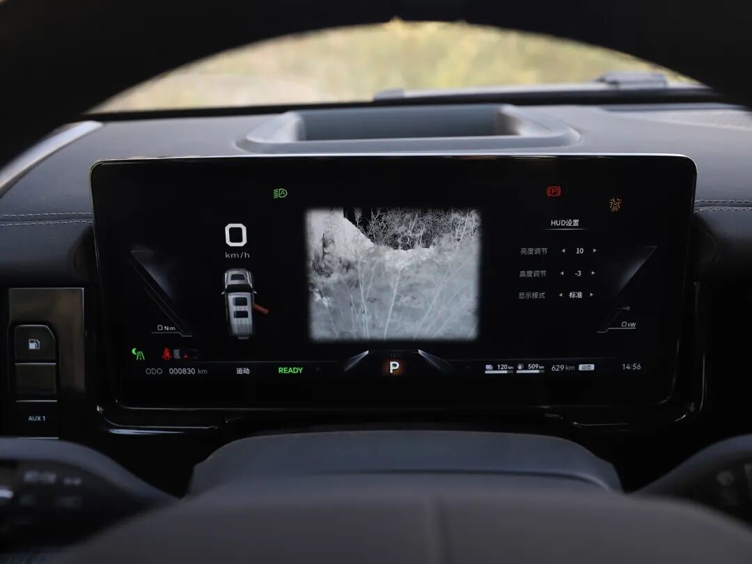 沙石路面,前车卷起的扬尘会严重影响视线,打开远红外夜视系统,系统会自动识别前车,跟车距离近的话还会有预警,对提升行车安全大有裨益,夜视系统最远可探测400米。