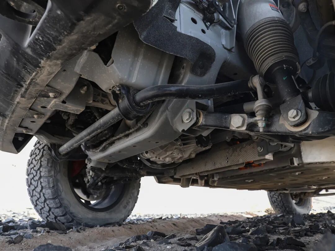 新车采用非承载车身和前后双叉臂独立悬架,同时配备有CDC连续可变阻尼减振器和空气悬架。由于采用AT胎并且为了保证越野路段的胎壁支撑胎压打到了将近3.0bar,所以在铺装路面会有一些细碎的振动传递进车内。遇到长波起伏时会感觉车辆有一些忽忽悠悠的那种感觉,这点与一些大排量硬派越野车比较接近。
