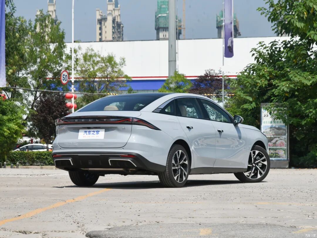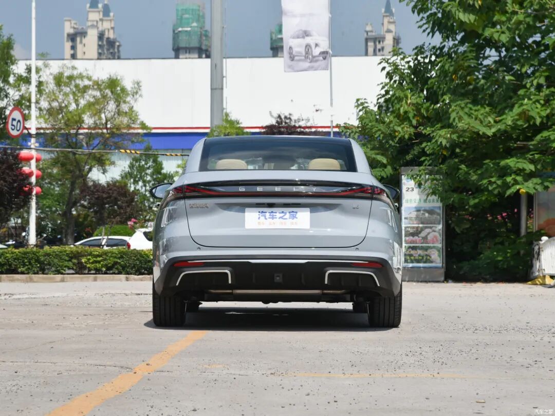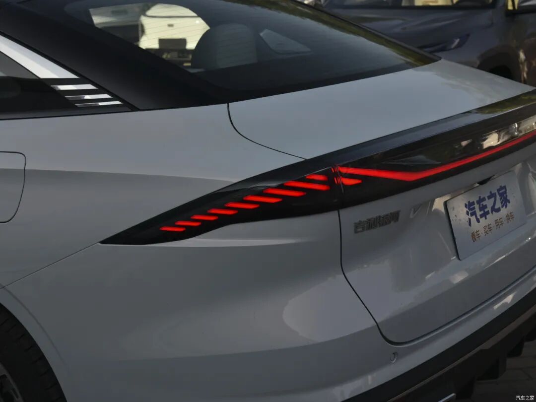 车尾造型饱满圆润而且层次感也不错,贯穿式尾灯两侧光源采用阵列式布局,设计感出色。灯组中心位置设有GEELY标识。后包围银色装饰以及扩散器设计对提升运动感大有裨益。