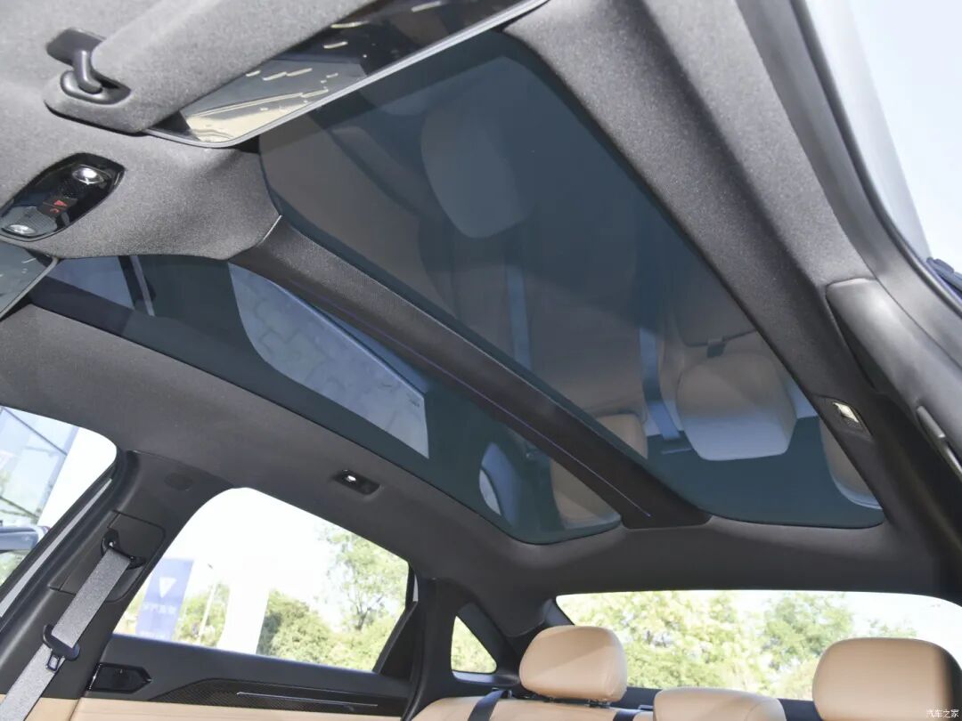 后排座椅采用相同的风格,中央扶手、杯架、空调出风口、电源接口都没缺席,此外全景天幕采用左右分布的长条形布局。