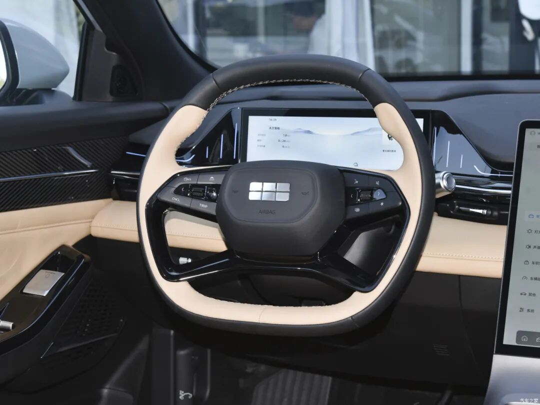 四辐式多功能方向盘是银河系列的家族样式,双拼配色更显时尚。左侧按键主要控制驾驶辅助功能,右侧按键主要控制多媒体系统,方向盘后方布置了电子式怀挡。