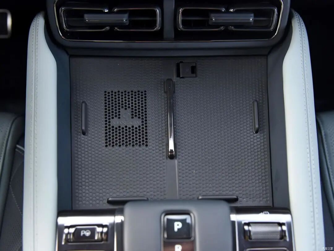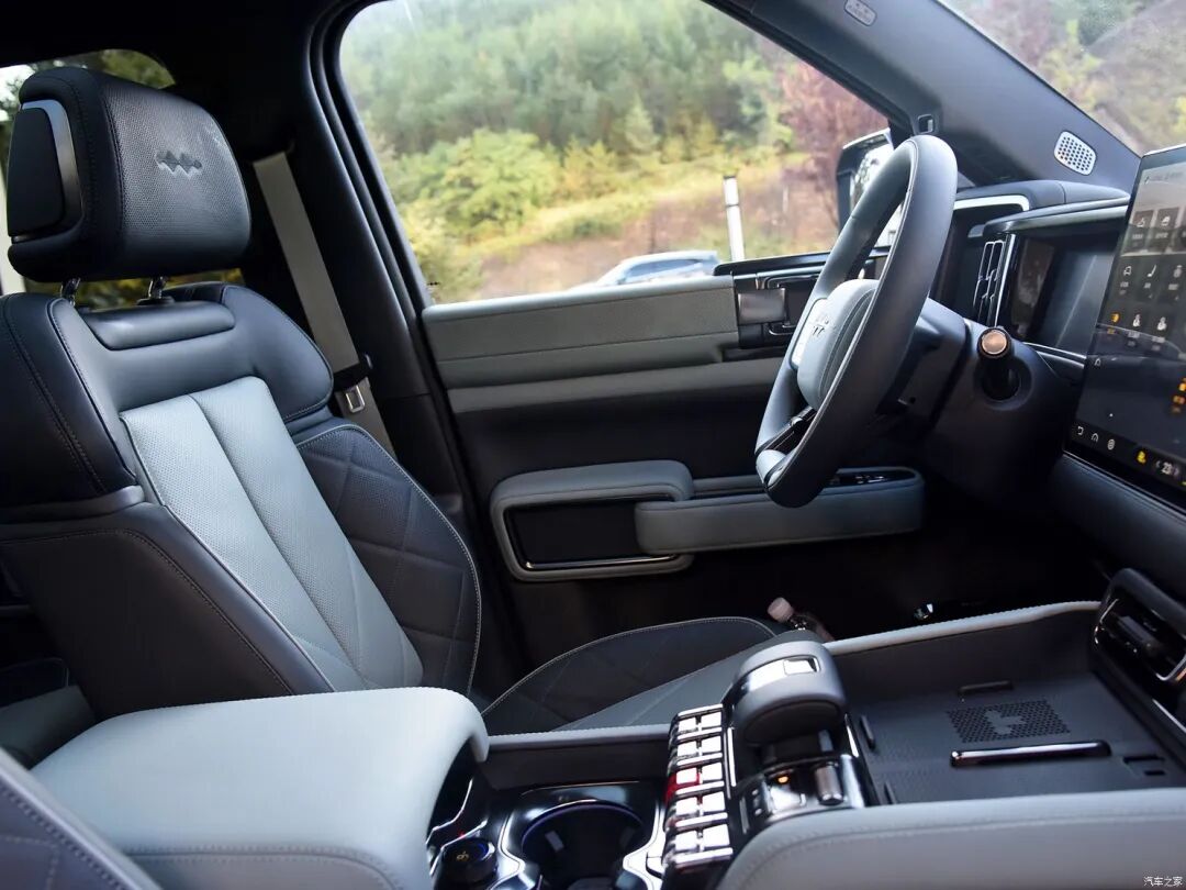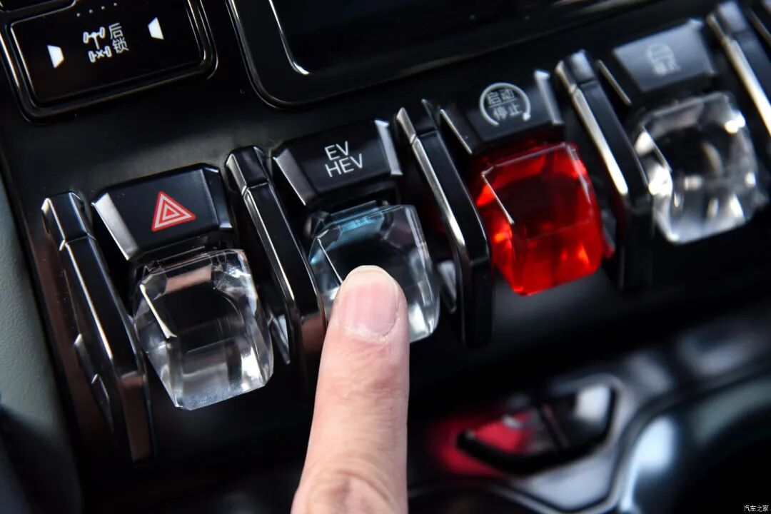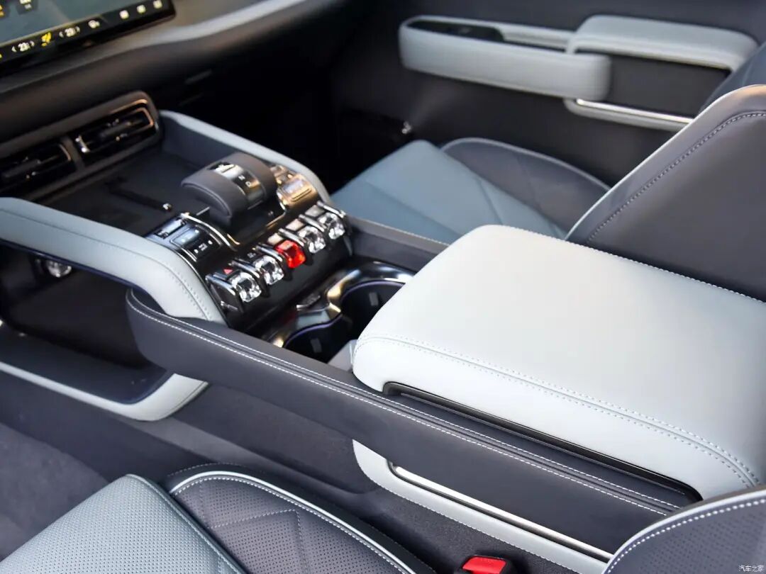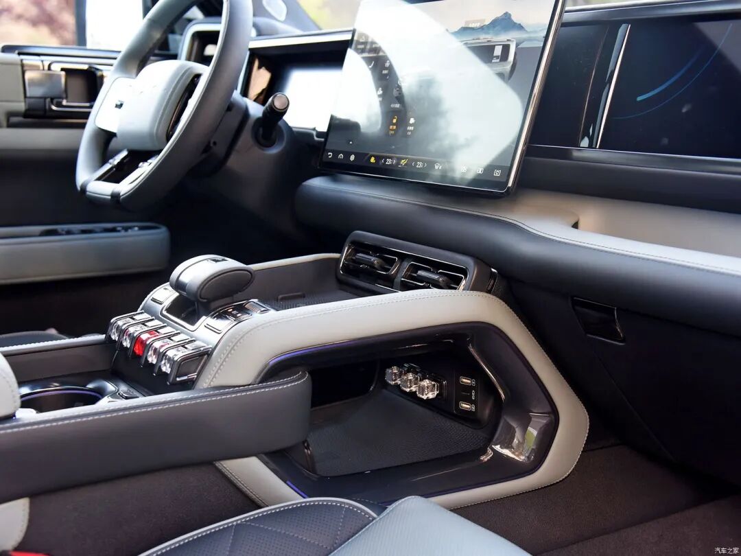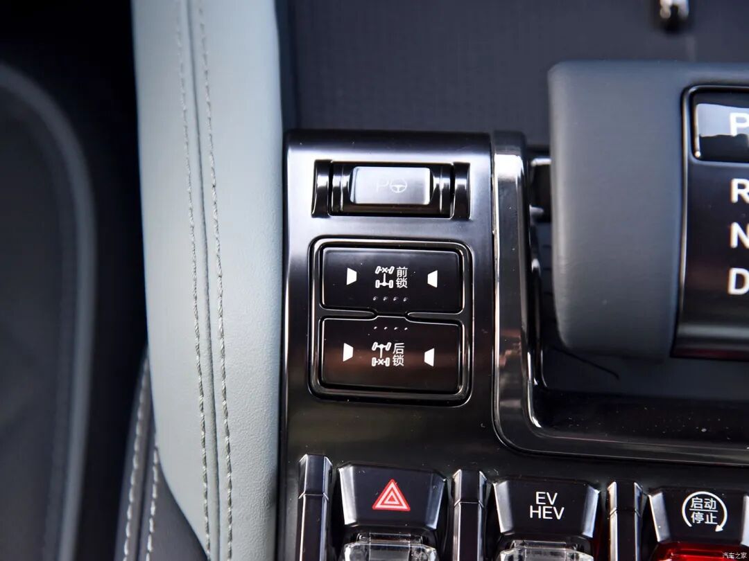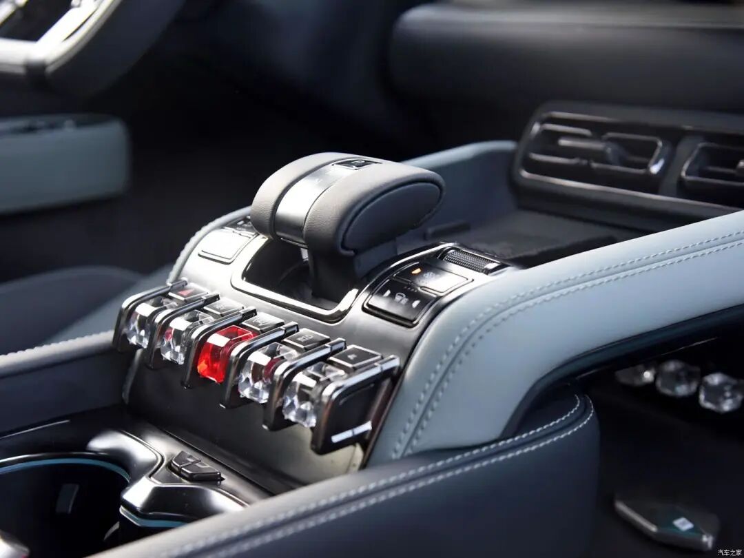 挡杆下方的一排水晶透明按键太酷了,前后差速的实体按键则采用了最严肃的设计形式,布置在挡把旁边,按键尺寸足够大,方便冬季驾驶员戴手套时更易直接操作。挡把本身还是个大彩蛋,车辆启动时整个挡把会自动“长出来”,灭车了就降下去,给人满满的仪式感。