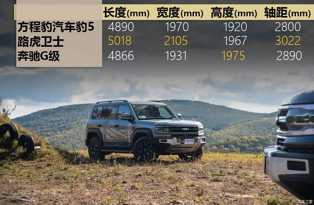 外观设计部分今天不打算多聊,因为豹5的外观在8月中已经正式发布,后面又拉去了成都车展,想必不少网友都已经摸过实车了。不聊设计的话,那外观部分就来细看下配置,但豹5毕竟是台玩硬的SUV,要先来看下它外观上的参数能不能体现硬核身份,方盒子的造型让人很自然地联想到两个越野标中标,路虎卫士和奔驰G级,尺寸一对比就清晰起来,豹5这款车身形上跟奔驰G级更接近一些。