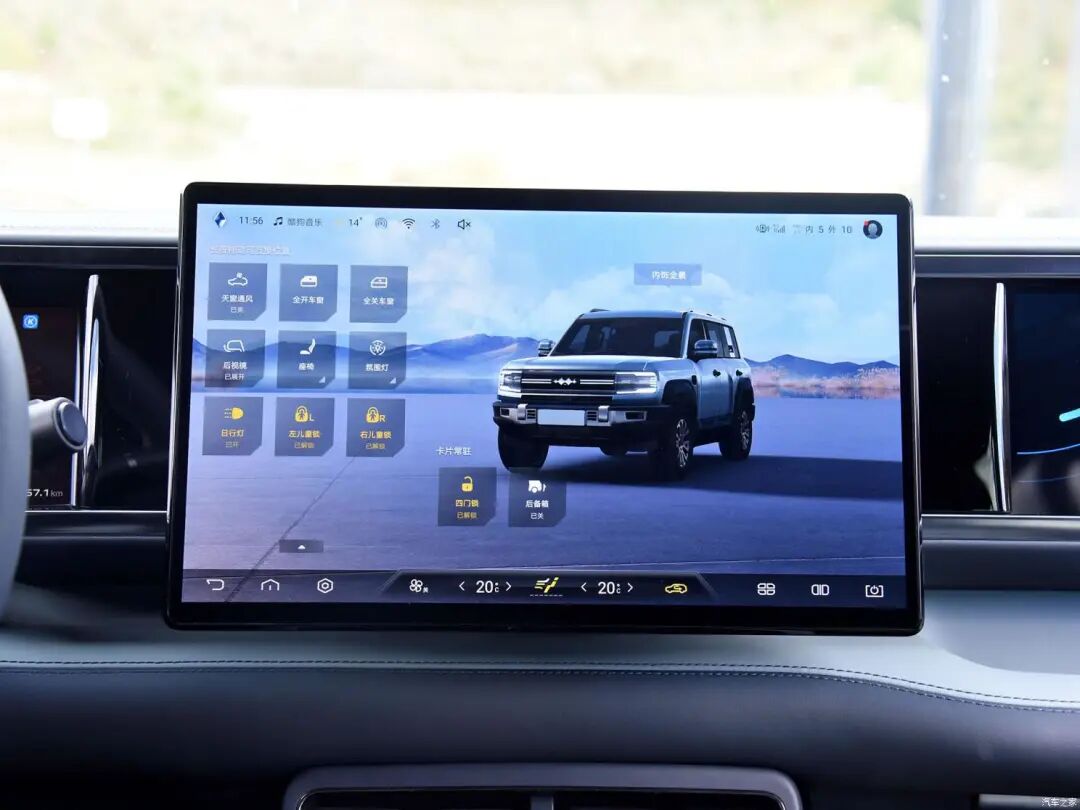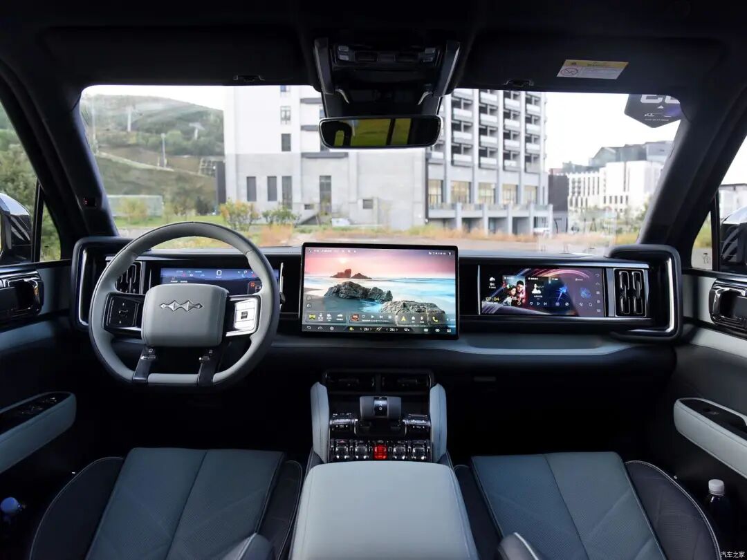 豹5内饰延续了硬派的风格,中控台部分共搭载了三块屏幕,中央是一块15.6英寸2.5K高清中控多媒体屏,主驾采用12.3英寸仪表屏,副驾位置搭载12.3英寸多媒体娱乐屏。豹5内饰设计整体基于“锁扣”这一理念,象征着链接和独特,意味着力量与安全,和外观进行呼应。在内饰颜色方面,官方推出了日蚀蓝、浅滩绿、风暴米3款内饰配色。