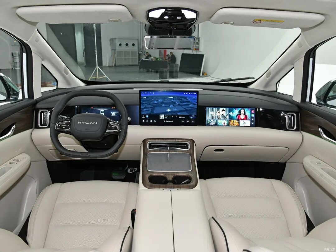 进入车内可以看到,合创V09的内饰中控台仅有空调出风口和杯架设计,其它全部功能都集中在大尺寸触控屏之上,10.25英寸液晶仪表、14.6英寸中控屏以及12.3英寸副驾驶屏,从左贯穿到右,这也是当前许多电动车的做法。合创V09还将配备手机无线充电器以及充电接口等配置,22个扬声器、以及天窗也没有缺席。新车还搭载H-VIP 3.0智驾互联系统,搭载激光雷达,可实现高阶辅助驾驶。