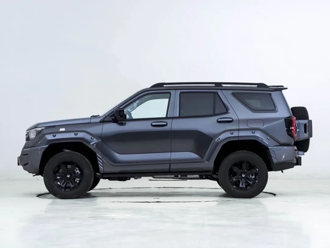 车侧视觉效果非常粗犷硬派,外露铆钉式轮眉对提升立体感和视觉张力大有裨益。独特的腰线以及门板内凹设计带来出色的光影效果。新车接近角33°、离去角30°,满载最小离地间隙224mm,最大涉水深度800mm。