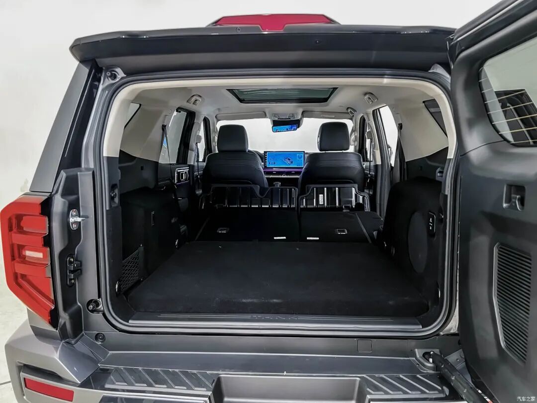 车尾设计非常硬核,半露式外挂备胎搭配机械感满满的尾灯带来十足的狂野气息。备胎外侧硕大的TANK标识直接亮明身份。侧开式尾门在硬派越野车上常见,后包围的造型细节与前包围形成呼应。