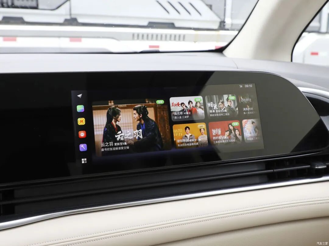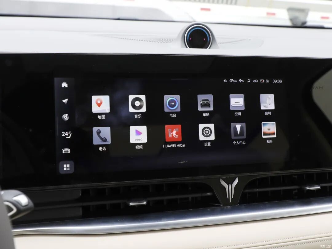 中控屏以及副驾娱乐屏均为12.3英寸,车机系统由高通骁龙8155芯片提供算力支持,集成了多指飞屏操控、语音助手、在线导航、影音娱乐、车辆设置、华为HiCar、全景影像、行车记录仪等功能。副驾娱乐屏集成了爱奇艺、酷我音乐、K歌等放松娱乐应用。