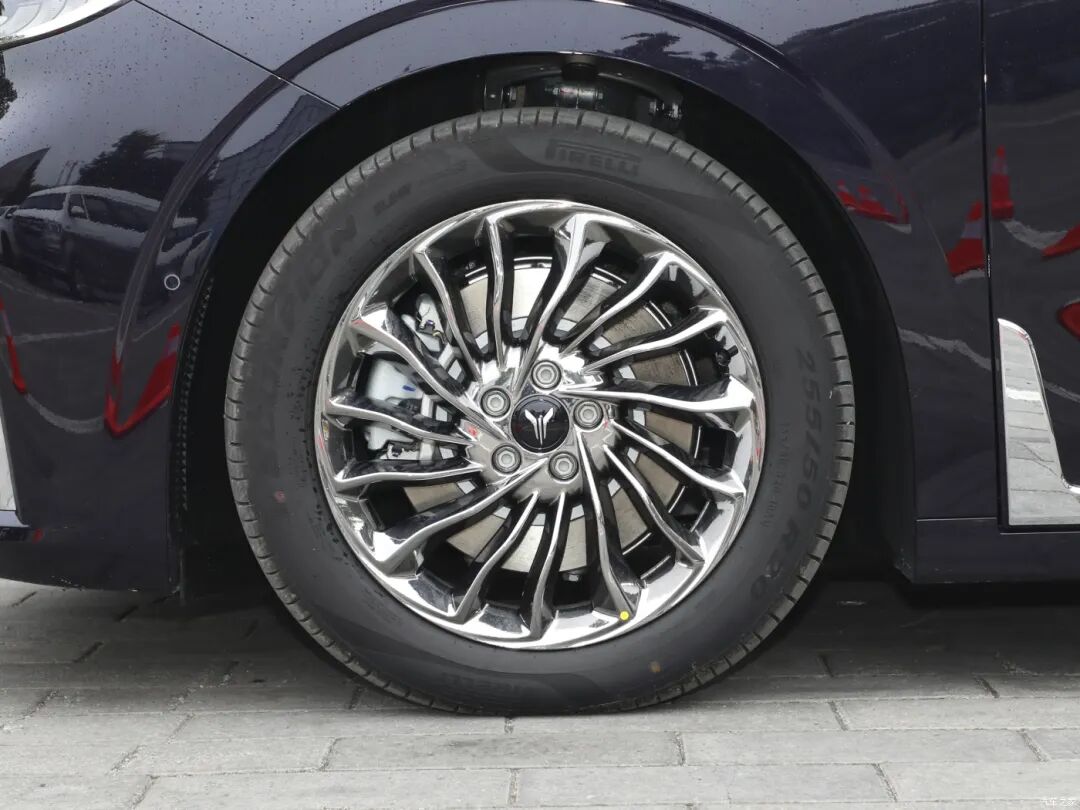 20英寸轮圈是全系标配,实拍车型的电镀风格多辐轮圈质感不错,与整车风格形成完美契合。轮胎采用倍耐力SCORPION系列电动车专用轮胎,规格为255/50 R20。