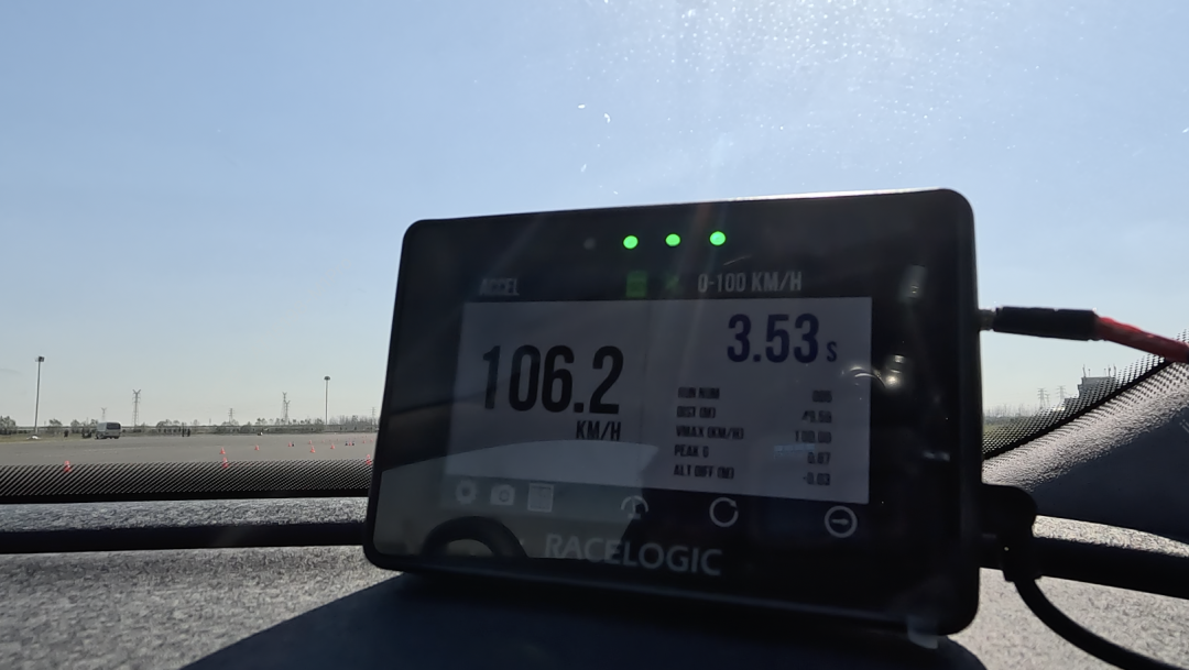 经过几轮测试,我们取得的最优成绩为3.53秒,与官方给出的3.49秒成绩近乎一致。此外,还有一点要说明,我们是全场最后一家测试加速的媒体,车辆的电量不同,做出的成绩也会有些许差异,不过该成绩已经很不错了。