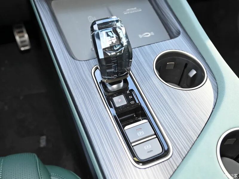 电子挡杆造型比较有特点,前方设置有手机无线充电面板,后方则是电子手刹、自动驻车功能键和杯架。
