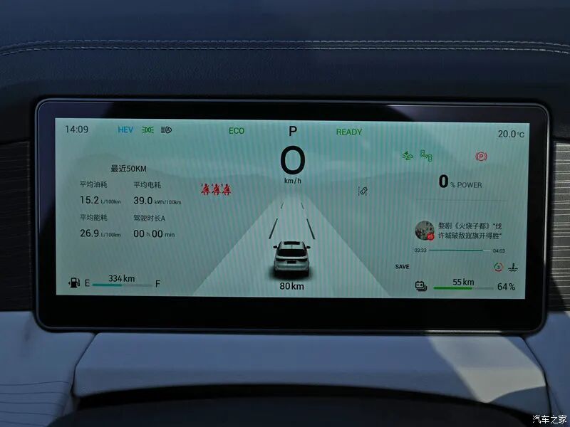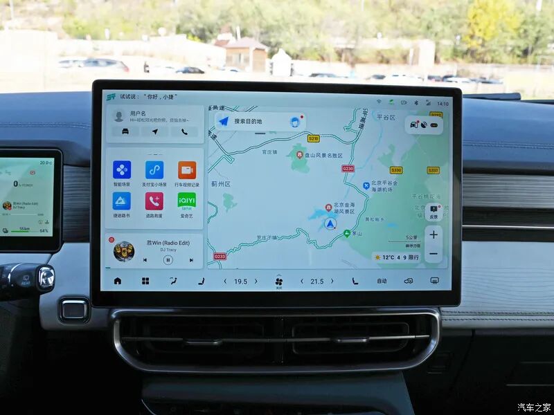 15.6英寸中控屏搭载高通骁龙8155芯片,集成了在线导航、语音助手、车辆设置、全景影像、爱奇艺、网易云音乐、云听、行车记录仪等功能,可以胜任日常使用。此外,高配车型还具备L2级驾驶辅助的能力。