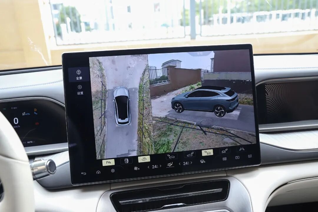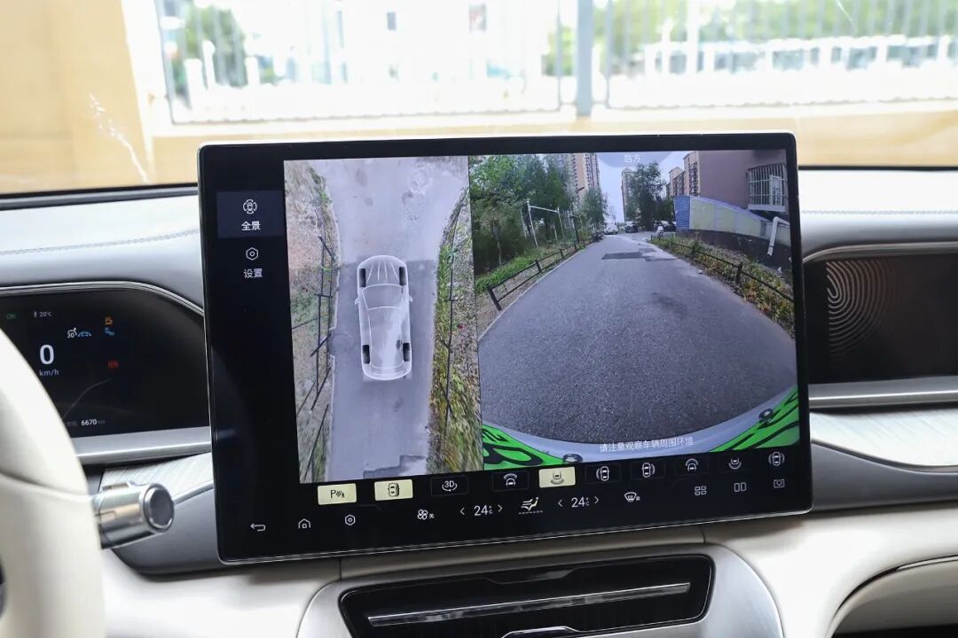 全景影像系统清晰度还可以,可以切换显示前后左右、前后广角、左右侧车轮等不同视角。透明底盘功能也没有缺席,而且还支持显示3D视图,实用性出色。