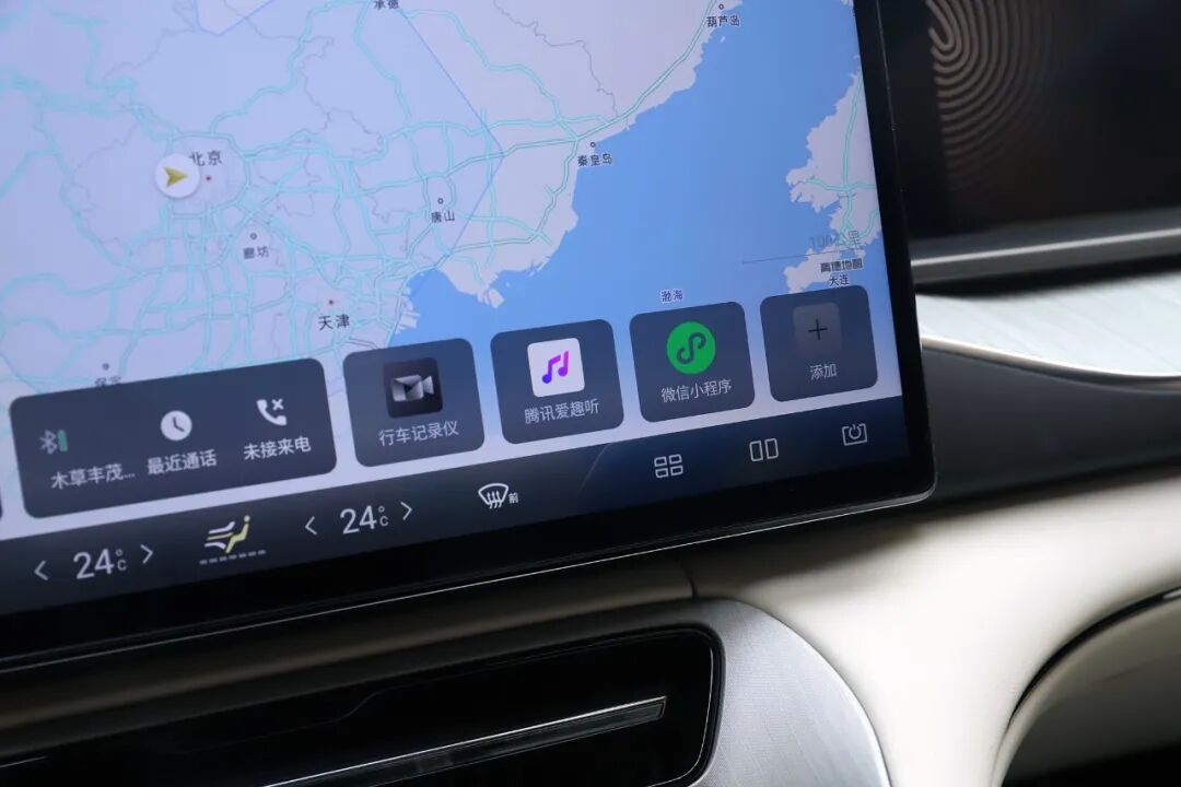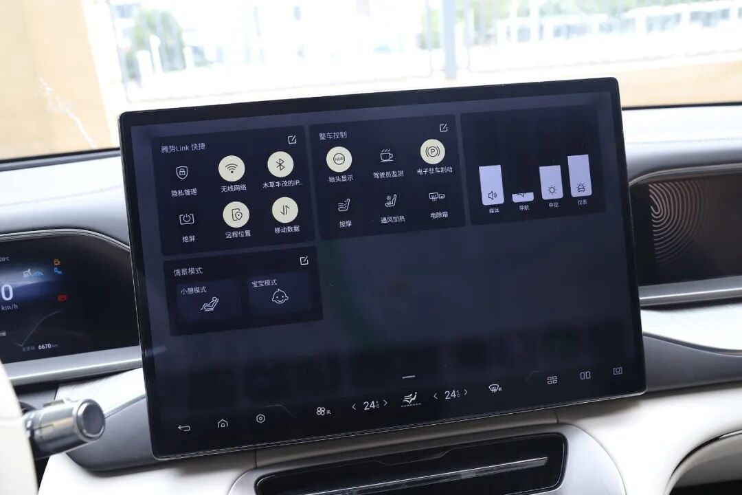 腾势Link超感交互智慧座舱的主要载体就是这块达到17.3英寸的2.5k高清中控屏,尺寸很大,一上车目光就能被它吸引。其集成了智能语音助理、在线导航、在线影音娱乐、行车记录仪、应用市场、车辆设置、高清透明全景影像、车载K歌等丰富功能,可轻松满足日常使用。