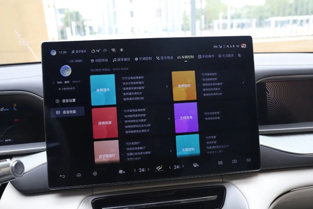 空调除了控制温度和风量之外,还可以控制风向吹面/吹脚/吹玻璃以及切换内外循环、风挡除霜等。车辆控制方面,座椅加热/通风/按摩、氛围灯、无线充电、遮阳帘、方向盘加热、香氛系统、后备厢开关、车窗升降等都支持语音控制,而且车窗可以按百分比调节。