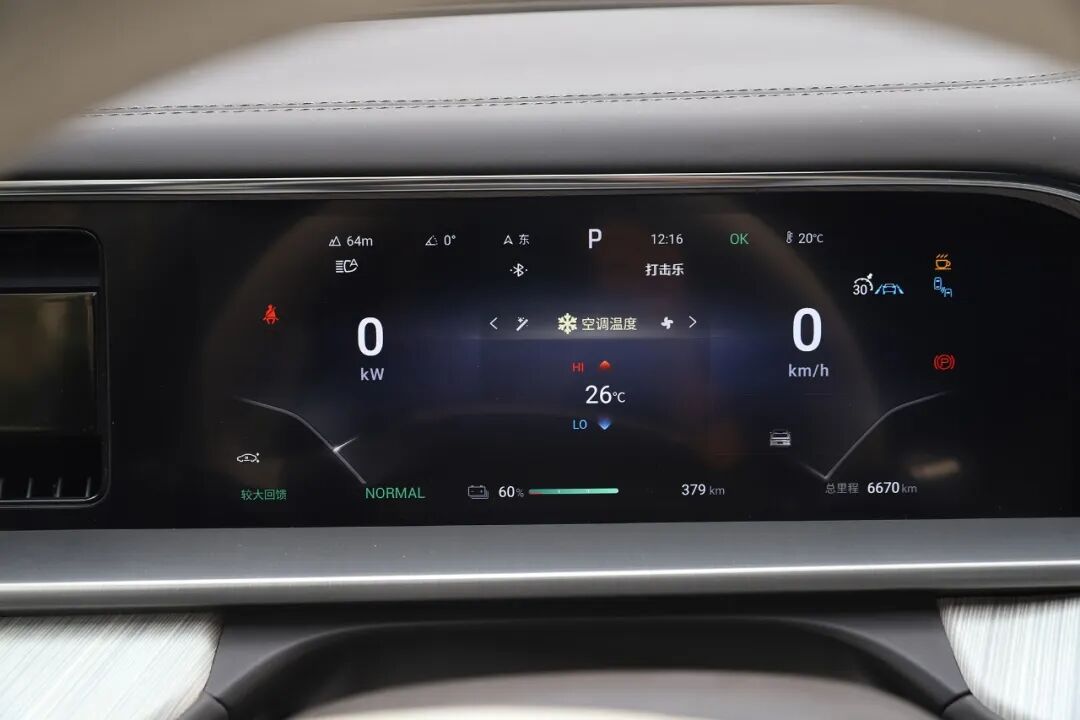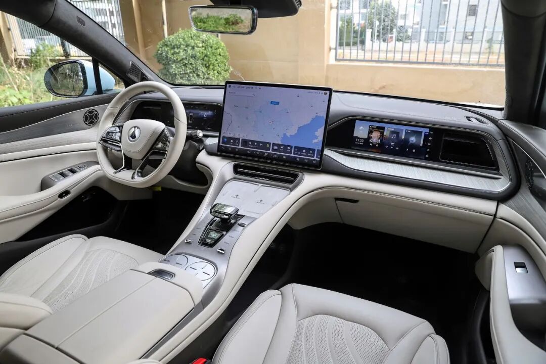 腾势N7的内饰拥有出众的豪华感和品质感,自左向右依次排开的三块大屏令人一上车就会不自觉的将目光投于其上,科技感被轻松拿捏。麂皮、NAPPA真皮、真铝以及速生真木等材质的使用对营造档次感大有裨益。腾势官方宣称N7拥有六联屏,包括中控屏、液晶仪表、AR-HUD、副驾娱乐屏以及两侧的空调出风口屏幕。