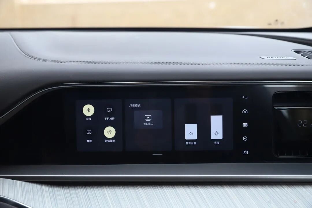 这块屏幕操作形式依然与平板电脑无异,从屏幕上方下滑会出现蓝牙、副驾律动、手机投屏、截屏、音量以及亮度等快捷控制按键。副驾驶唤醒语音助手会是这块副驾娱乐屏给予互动反馈,不妨碍驾驶员查看中控大屏的信息。