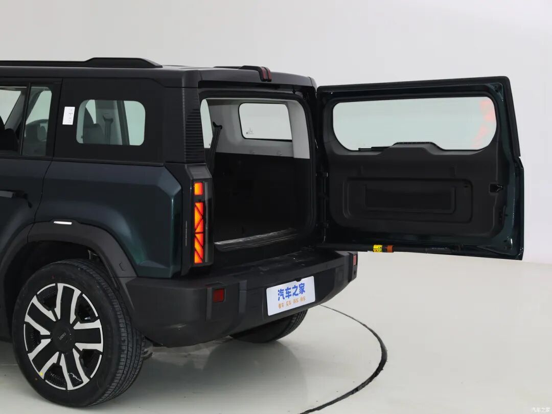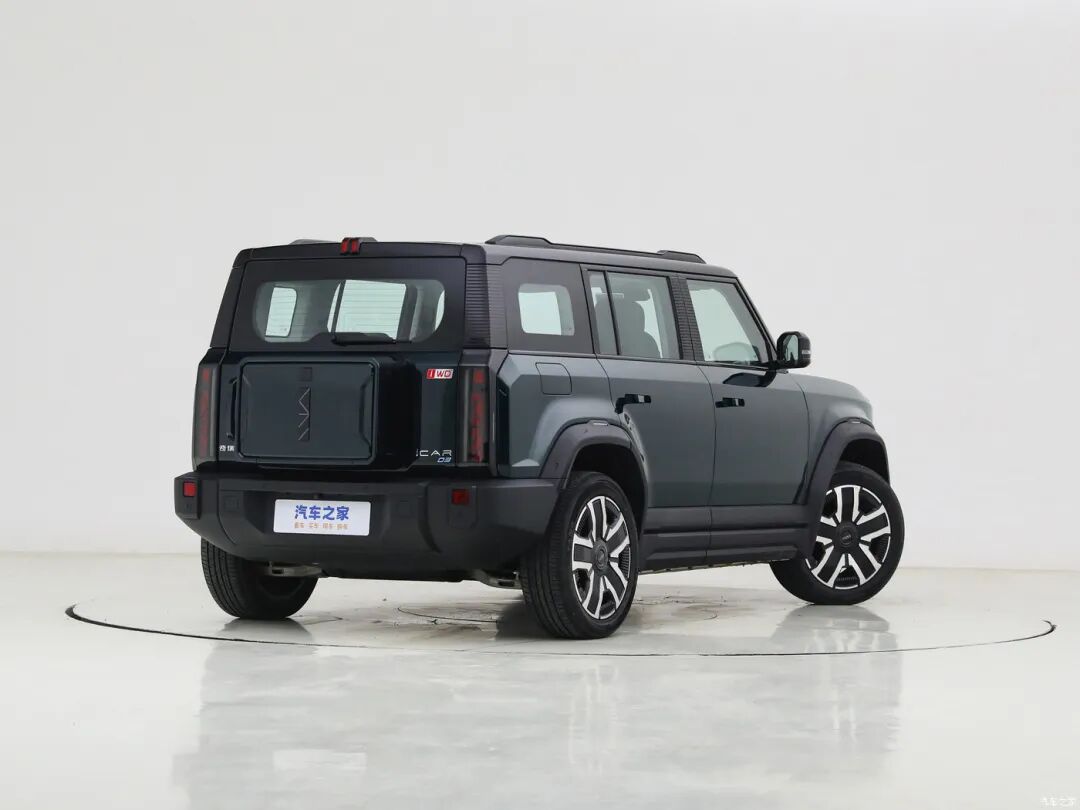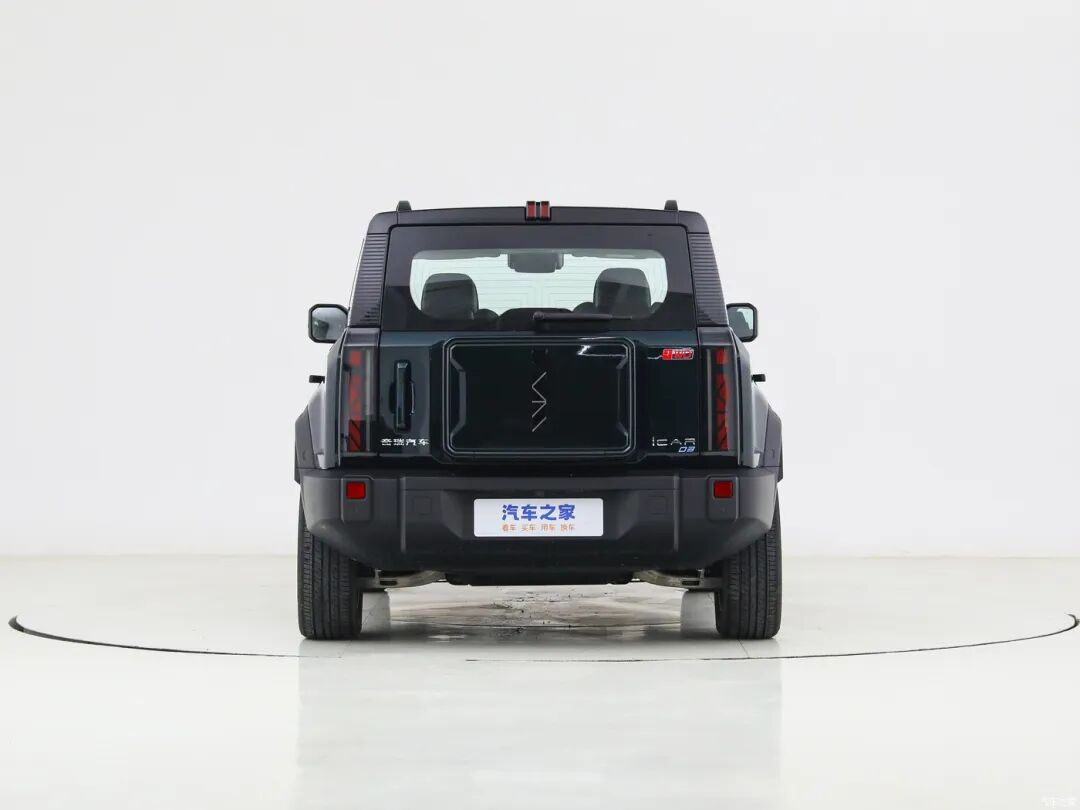 车尾展现出属于硬派越野车型的专属美感,上窄下宽的设计视觉上更显稳重。外挂的“书包”带有iCAR的品牌标识,后包围设计同样是走粗犷路线。
