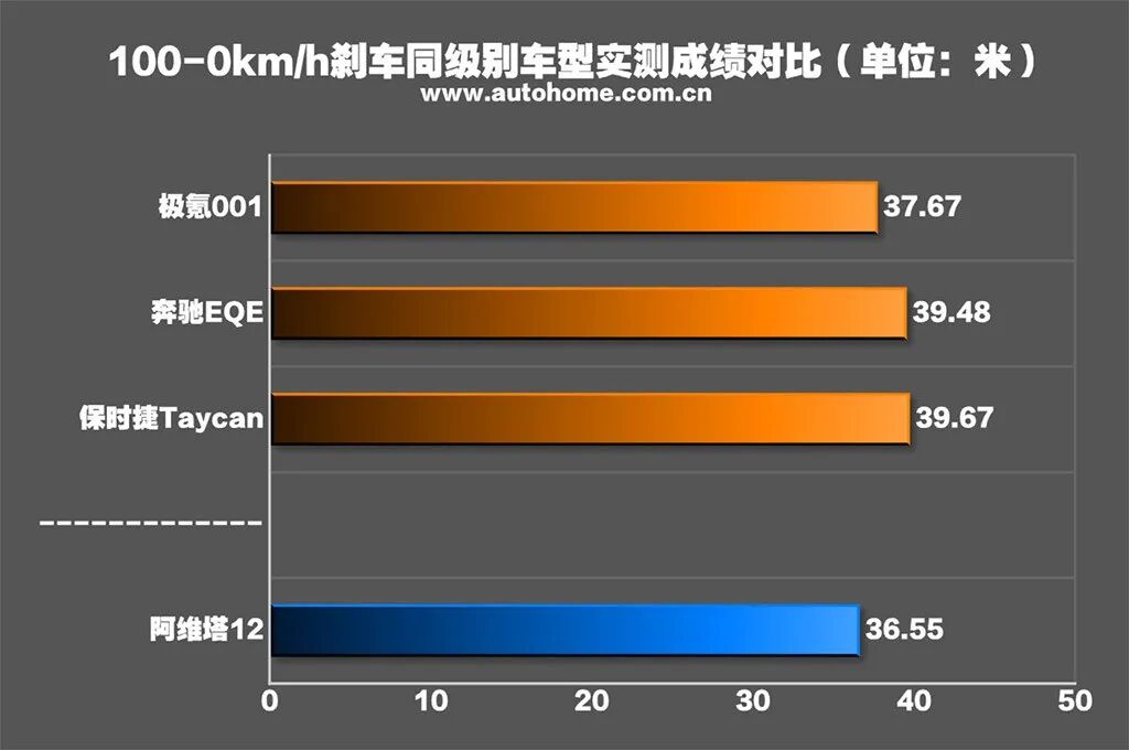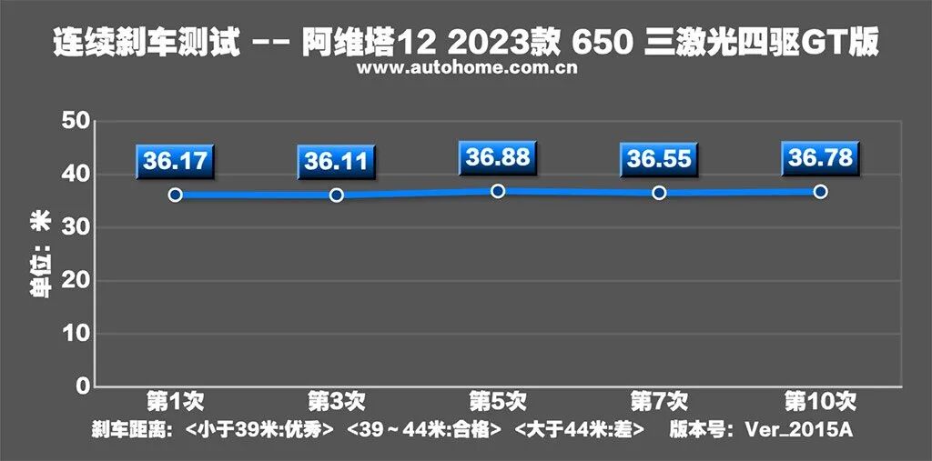 刹车方面,听听牌面就很值得期待了,顶配的GT版配备Brembo的全铝四活塞珊瑚红固定卡钳,轮胎也很猛,配置的是邓禄普新能源车专用轮胎系列e. SPORT MAXX,主打一个综合实力,注重静音、制动和操控方面的表现,相比之下,好看的运动轮圈造型都只能算是个顺便捯饬一下的小福利了。直接来看成绩吧,36.55米,同样配得上优秀的称号。