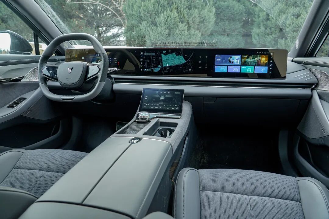 四块屏幕各司其职,仪表就不用多说了,显示车辆信息足够全面;中控屏集车辆相关功能调节与娱乐于一身,内置8155芯片,并拥有透明底盘;副驾屏以娱乐为主,提供视频、网络收音机等;中控台下方的屏幕主要是控制空调、座椅、车辆快捷操作、空气净化、香氛系统等等。大联屏有黑边不假,厂家做了一个很讨巧的设计,采用深色背景,尽可能地与黑边融为一体。