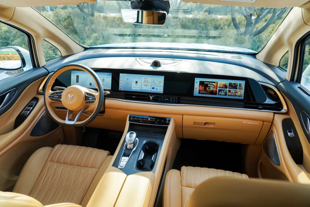 梦想家内饰延续了岚图家族的多屏设计风格,有传统车企基因的新势力品牌在这方面也很擅长,而相比传统车企的产品来说,在科技感与功能性方面都有着不小的领先。用料方面较为考究,使用了大量皮质材料包覆,而顶棚及上立柱区域则为仿麂皮绒材质软包,再辅以镀铬饰条装饰后,豪华感不言而喻。