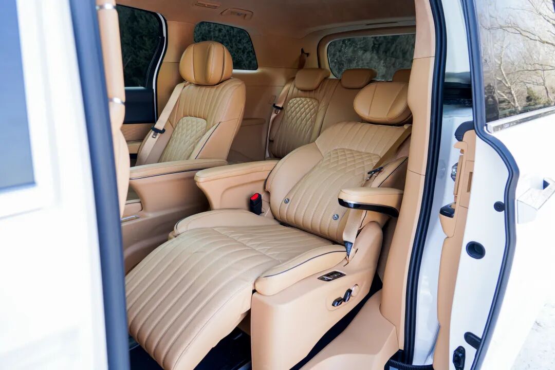 中排是重头戏,两张航空座椅,基本可以做到躺平的状态,上述的舒适性配置也有提供,同时还有座椅腿托、小桌板、电源接口等等。梦想家还有一个必杀技,配有空气悬架,除了对行驶质感有帮助的同时,还带有迎宾模式,可自行降低悬架高度,便于老人、小孩上下车。