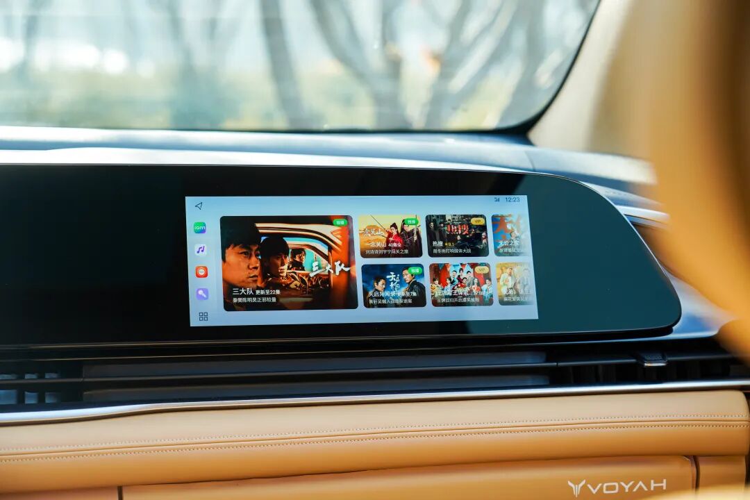屏幕矩阵因为车辆宽度的原因,中间的黑色部分也要更大,但对于一款MPV来说,这点不难接受。三块屏幕分工明确,仪表不用多说,中控屏多为车辆功能控制与娱乐功能,副驾屏为娱乐功能的载体。内置高通骁龙8155芯片,配合5G网络,当前主流配置,具体使用感受无功无过。