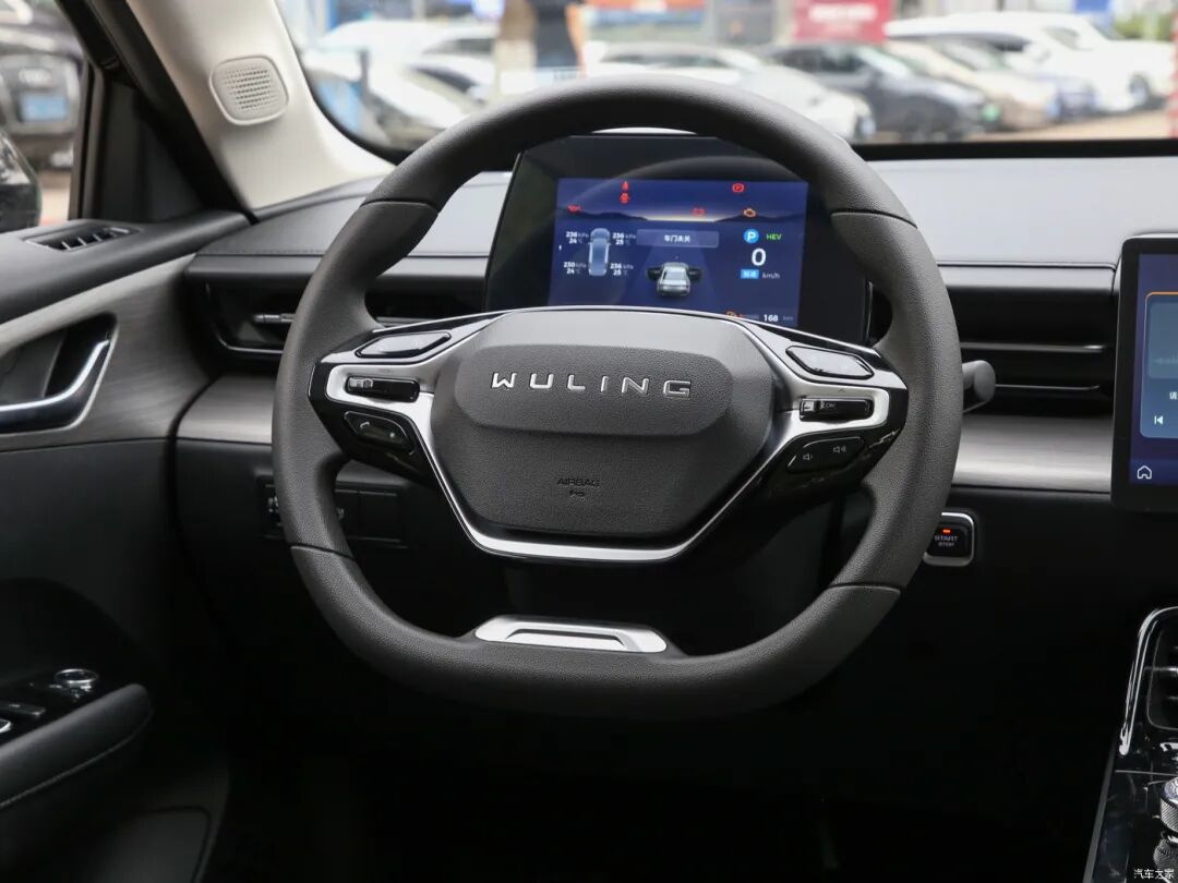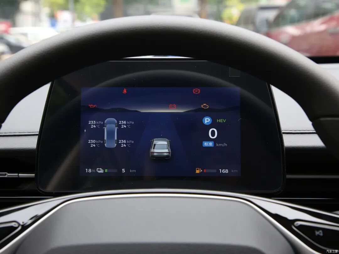 用手抚摸方向盘你便会发现,出于成本控制,其传承神车五菱宏光的衣钵,用上了塑料方向盘。全液晶仪表的尺寸为7英寸,可以显示轮胎压力、输出功率、混动系统能量流、驾驶模式等信息。
