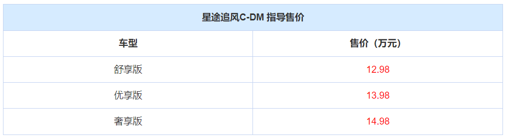 1月29日,星途追风C-DM正式上市,共推出三款车型,售价区间为12.98-14.98万元。该车最大的亮点是搭载了全新的1.5T C-DM插电混动系统,相较老款星途追风PHEV车型搭载的1.5TCI-DHT插混系统,C-DM插混系统具有充电更快、效率更高、更省油的优势,综合功率为326马力,纯电续航里程80km,综合续航里程1000km。详细车型售价如下: