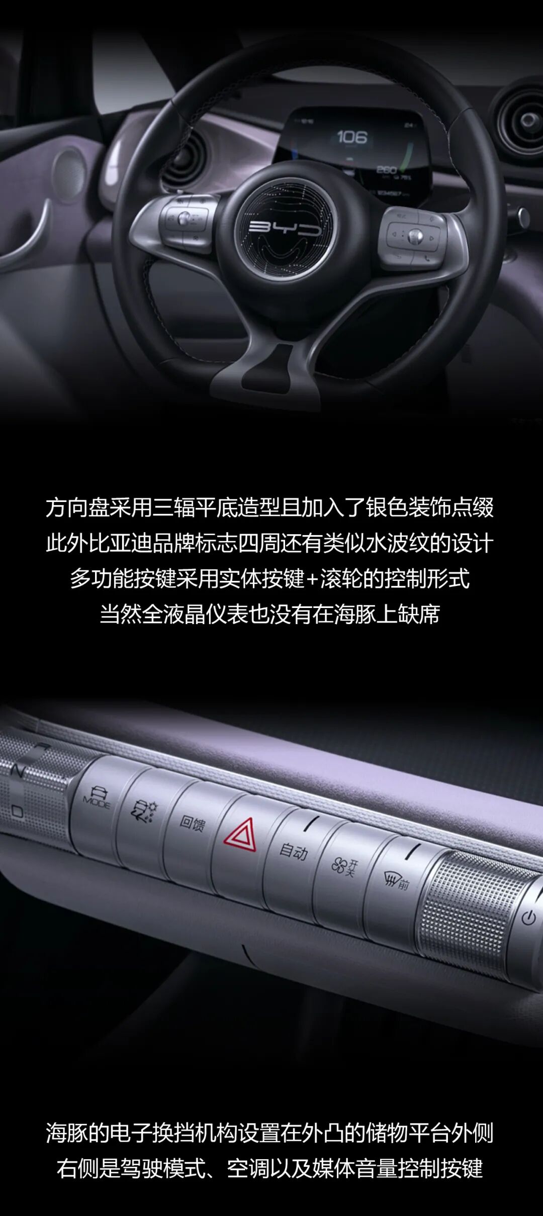 海豚是一款两厢纯电动小型车,基于比亚迪e平台3.0打造,该平台潜质出色可采用综合效率超89%的八合一电驱系统(海豚将配备),而且新一代SiC电控系统的功率密度也提升了30%,此外该平台还具有800V高压闪充技术。