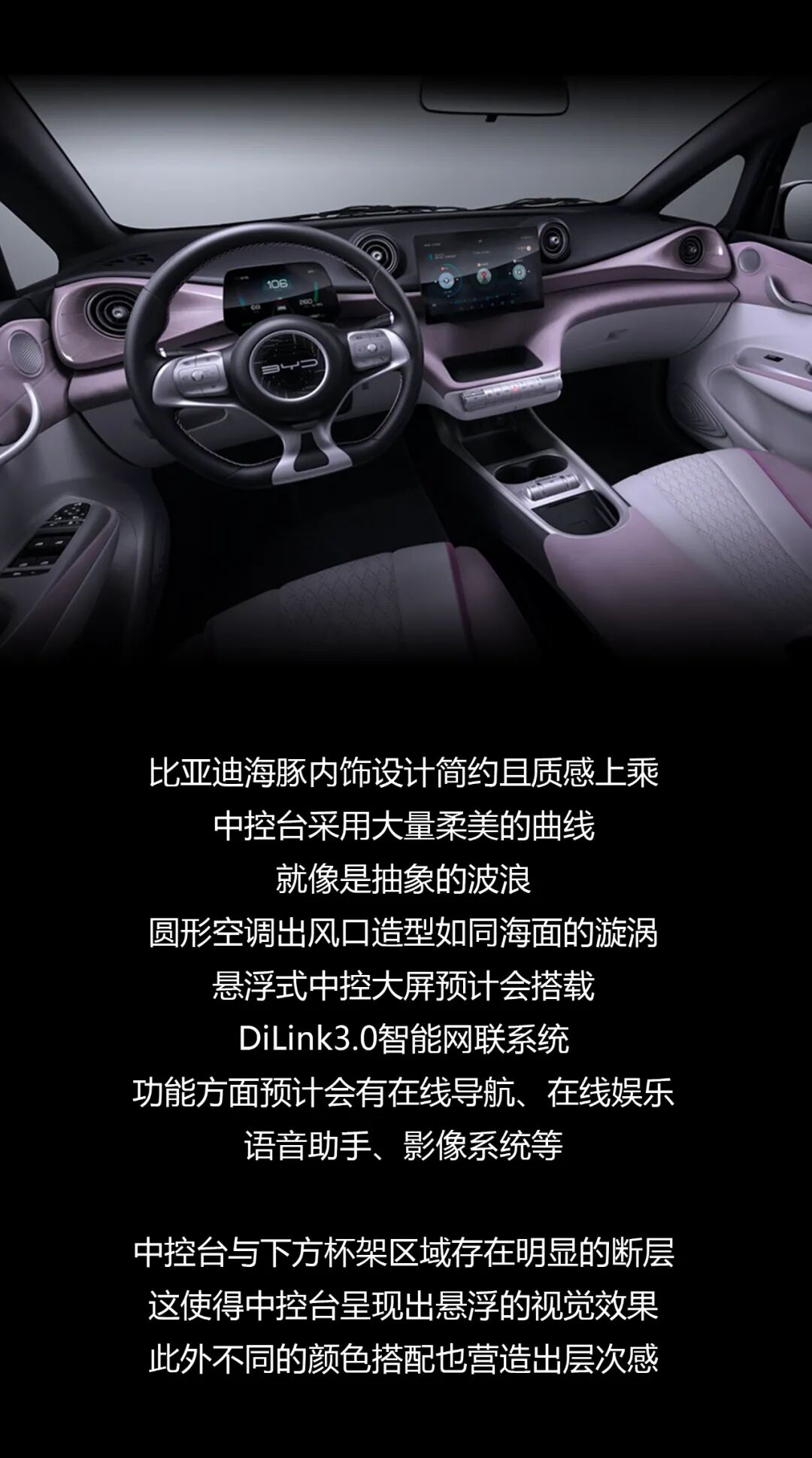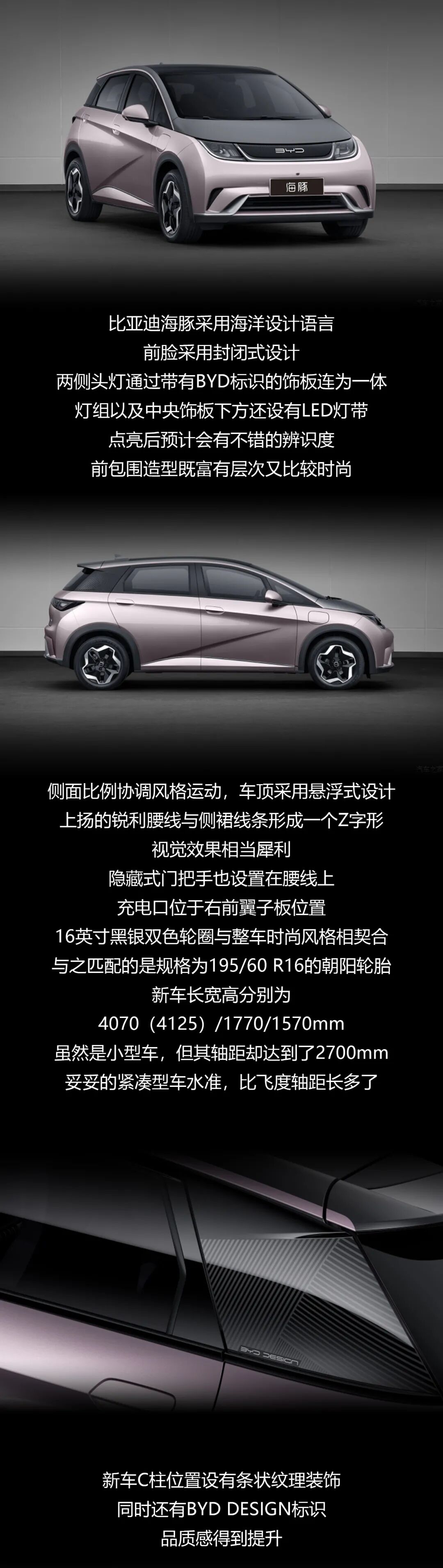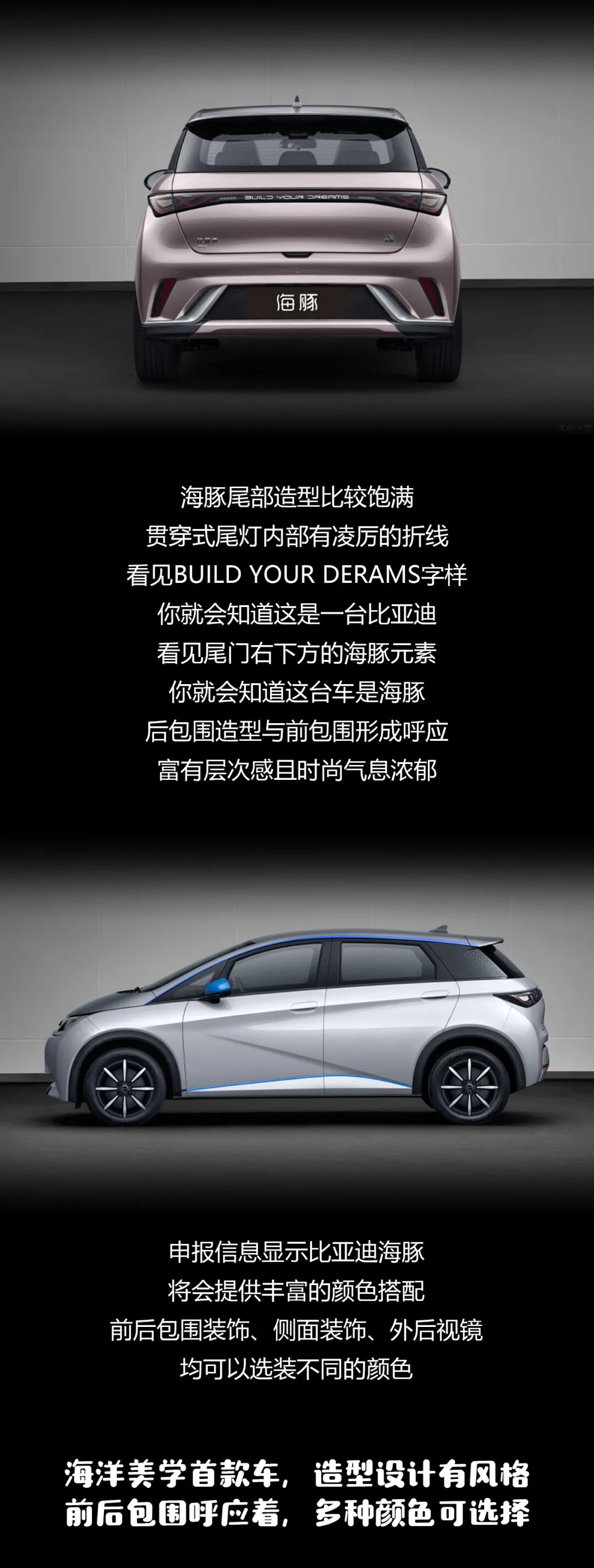比亚迪海豚由沃尔夫冈·艾格率团队打造,采用“海洋美学”设计语言,整体风格时尚动感。新车将搭载最大功率70kW的永磁同步电机,并配备磷酸铁锂刀片电池组。