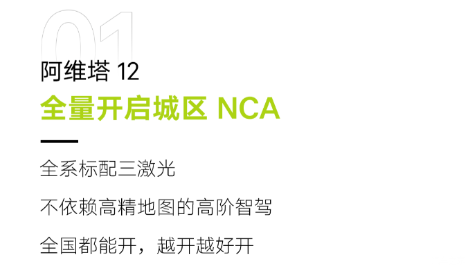 阿维塔12定位一款中大型轿车,目前在售三款车型,售价为30.08-40.08万元。这款车拥有修长、流畅的车身设计,车内配备35.4英寸4K环绕屏幕以及15.6英寸中控屏,搭载鸿蒙座舱系统。智驾方面,它全系标配了3颗激光雷达,此次官方宣布该车全量开启城区NCA功能。阿维塔12四驱车型搭载华为DriveONE双电机系统,前后电机最大功率分别为195kW/230kW;单电机车型最大功率为230kW。该车最大续航可到700km。